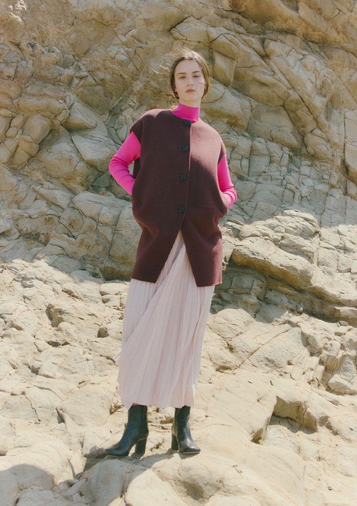 「ソフトな風合いのソリッドウールリバージレ。今シーズンはダークチェリーの深みカラーをセレクト。ピンクアイテムとのグラデーションスタイルは秋の始まりに最適。ジレの中に着るインナーを調節すれば、秋から冬までロングシーズン重宝します」。