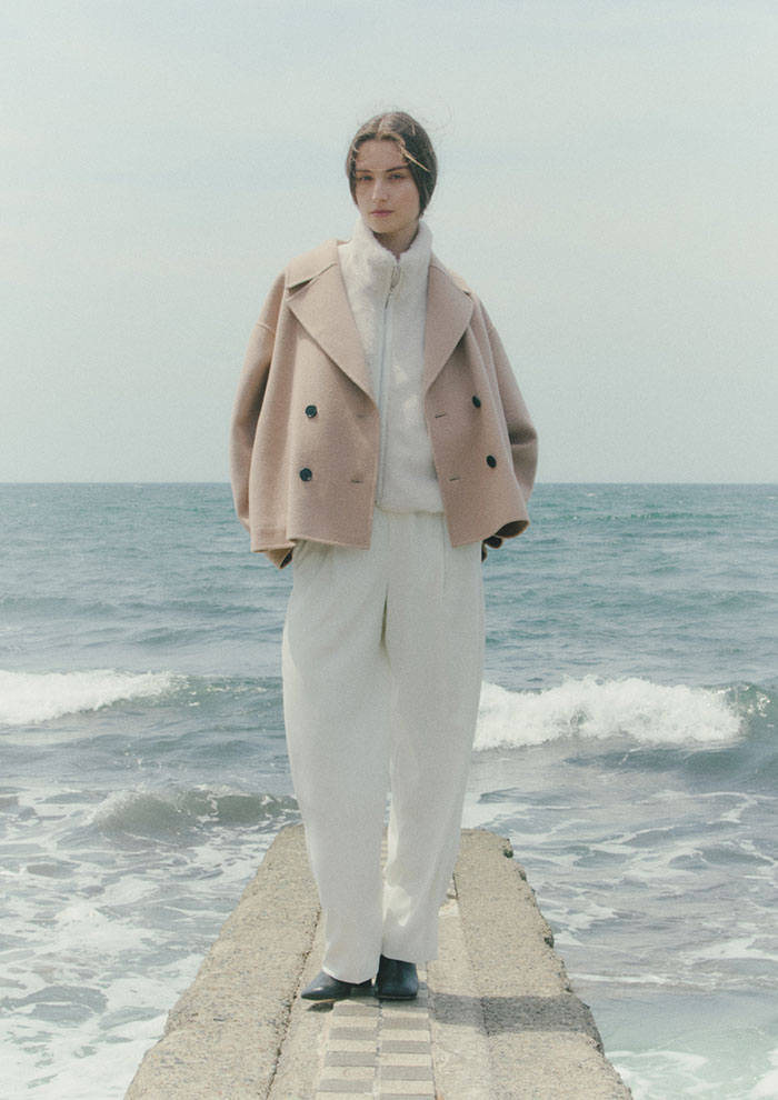 「先ほどご紹介したジレと同素材のジャケットコートは、ショート丈が旬なデザイン。オールホワイトのワントーンコーデに羽織って女性らしいしなやかさを感じさせて。フェイクファーのベストを中にレイヤードすることで、コーディネートにぐっと奥行きが生まれます」。