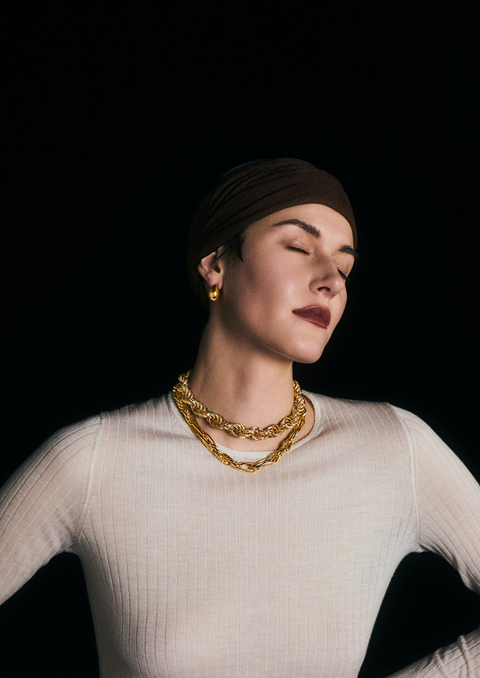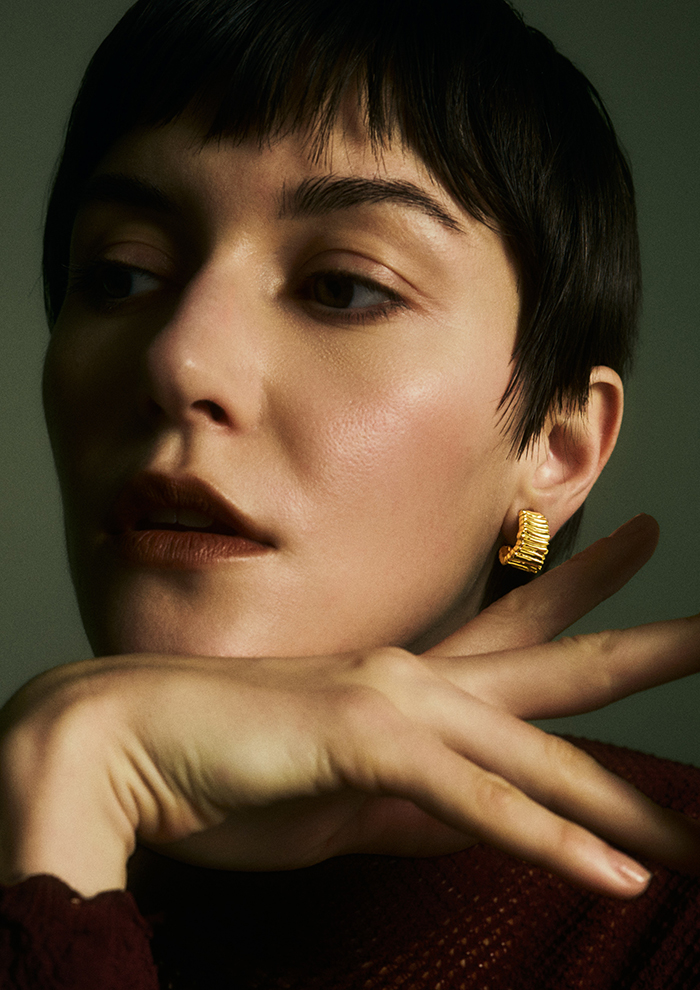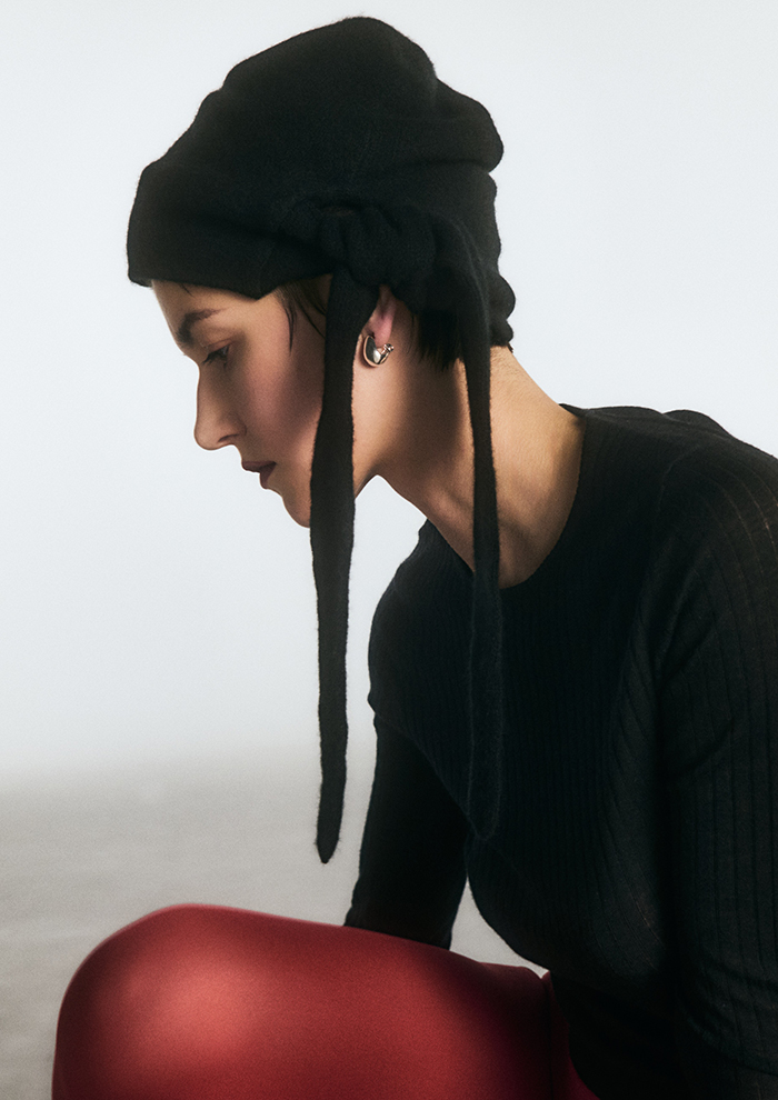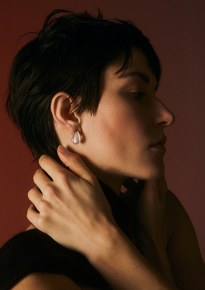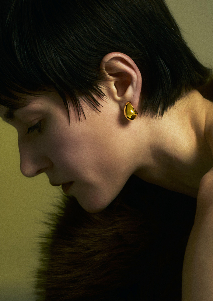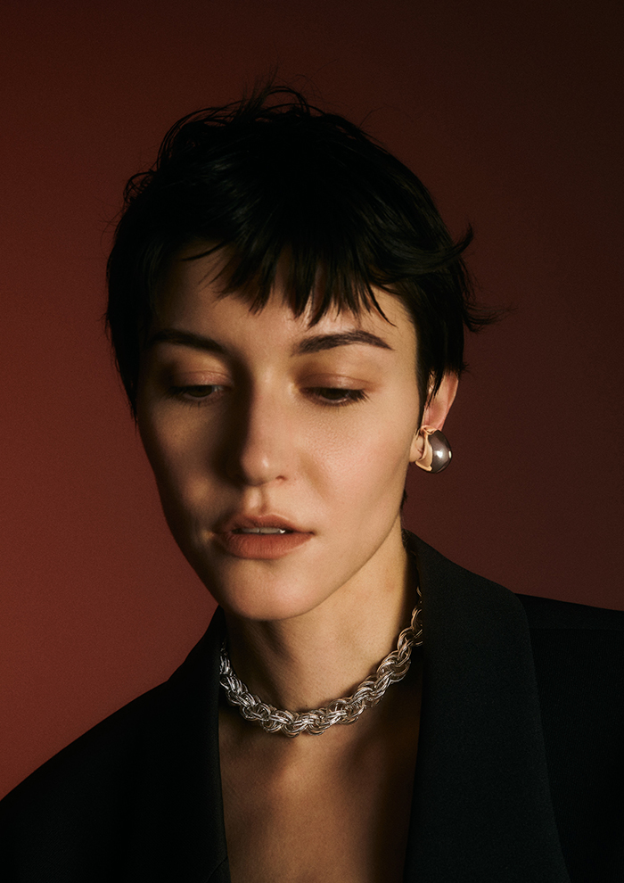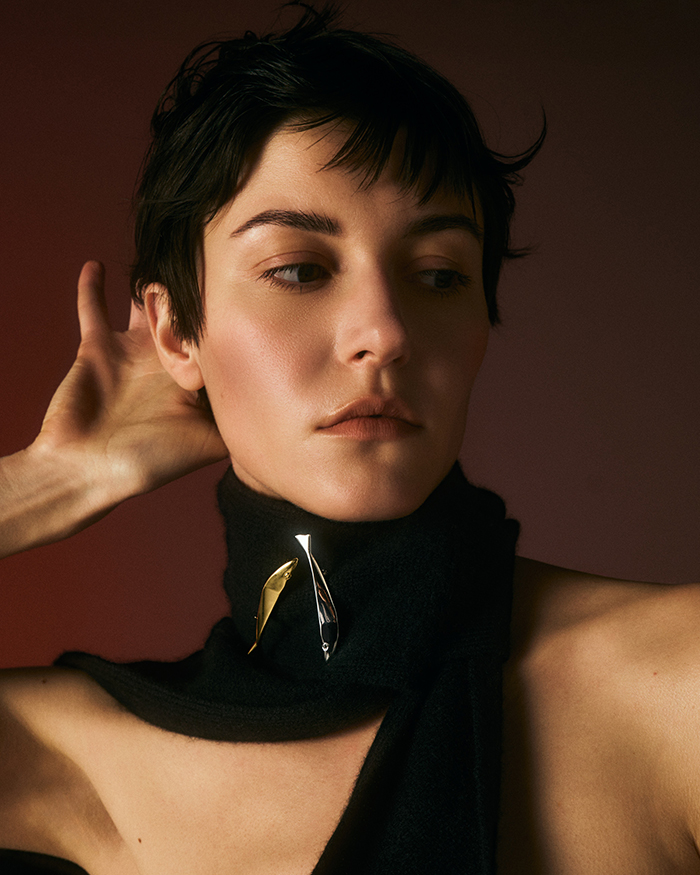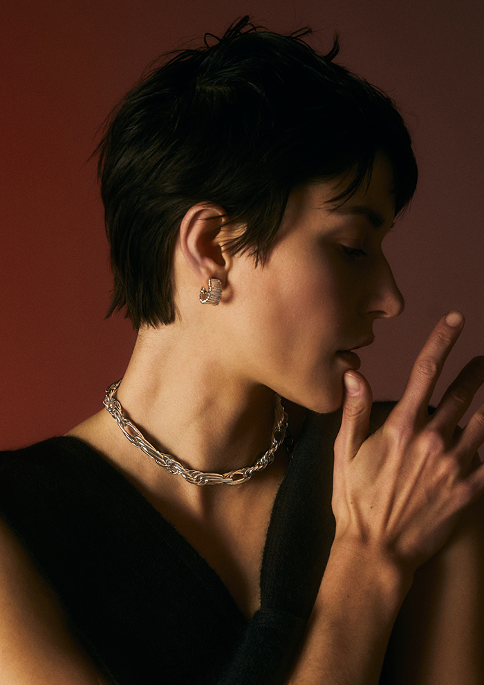 「桂樹の女神を着想源にした、神聖でリッチな佇まいは、身につけると高貴な重厚感を叶えてくれます。柔らかな幾何学的模様が、顔まわりにしなやかな印象をプラス。スウェットやデニムなど、カジュアルな装いに抜け感が欲しいときにもぴったり」。