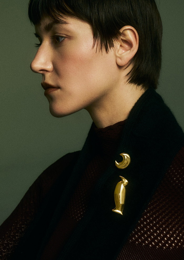 「愛嬌のあるペンギンを起用したブローチ。カッティングを入れることでシャープな印象に。メタリックの上品な輝きが、モード感を加算します。プレーンなニットやストールに飾るだけで、装いのテンションがアップ」。