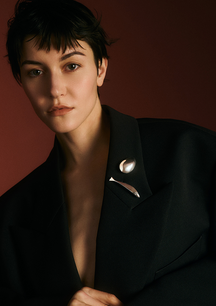 「ミニマルな曲線とグラフィカルなカッティングで表現した魚は、端正でモダンな雰囲気。ジャケットに飾って、クールなスタイルにユーモアを加味してみて。“calm ブローチ”や“wonder ブローチ”と組み合わせるのもおすすめ」。