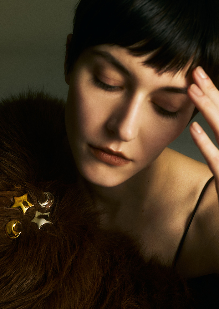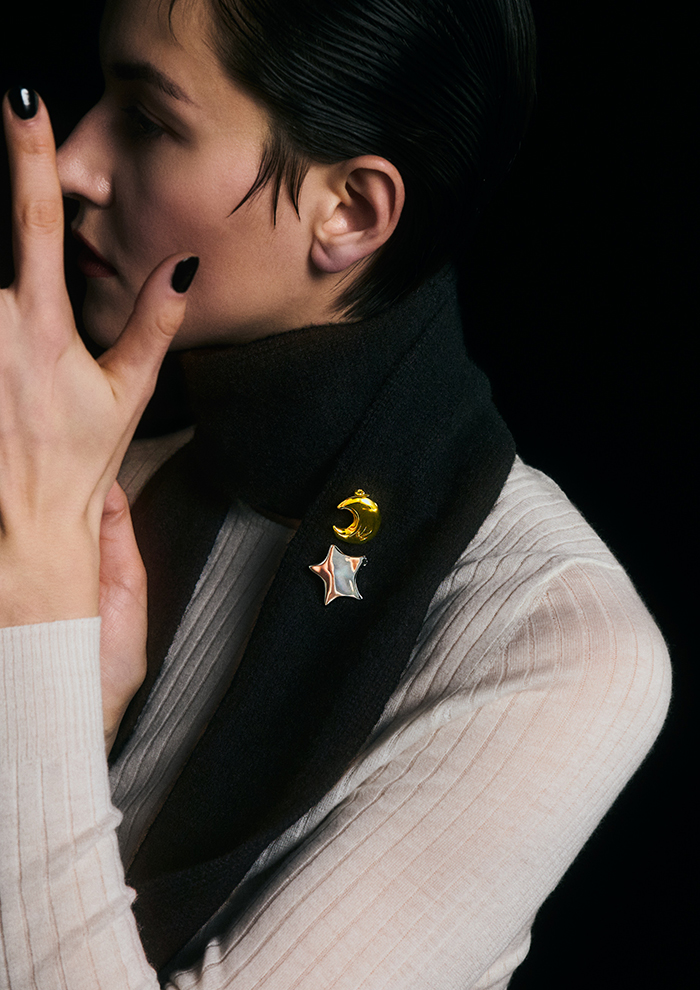 「“wonderブローチ”は、新奇なものと出会って驚く情感を、スターの形で表現。ふくよかな厚みをもたせることで、優しくモダンな雰囲気に仕上げました。“tsuki ブローチ”は、幻想的な月を丸みのあるシルエットに落とし込み、可憐なムードを上乗せ。メタリックの輝きによって、大人っぽさと品の良さも兼ね備えています。どちらもジャケットやコートの襟元に添えるほか、プレーンなニットやストールのアクセントにも」。