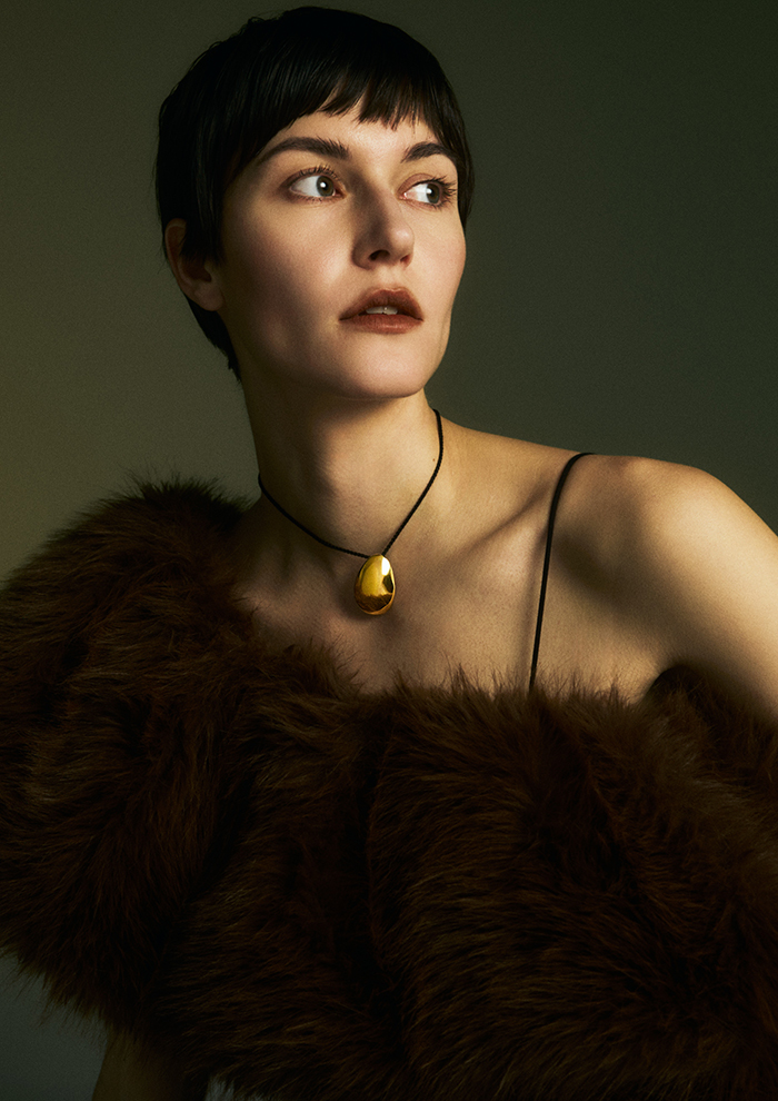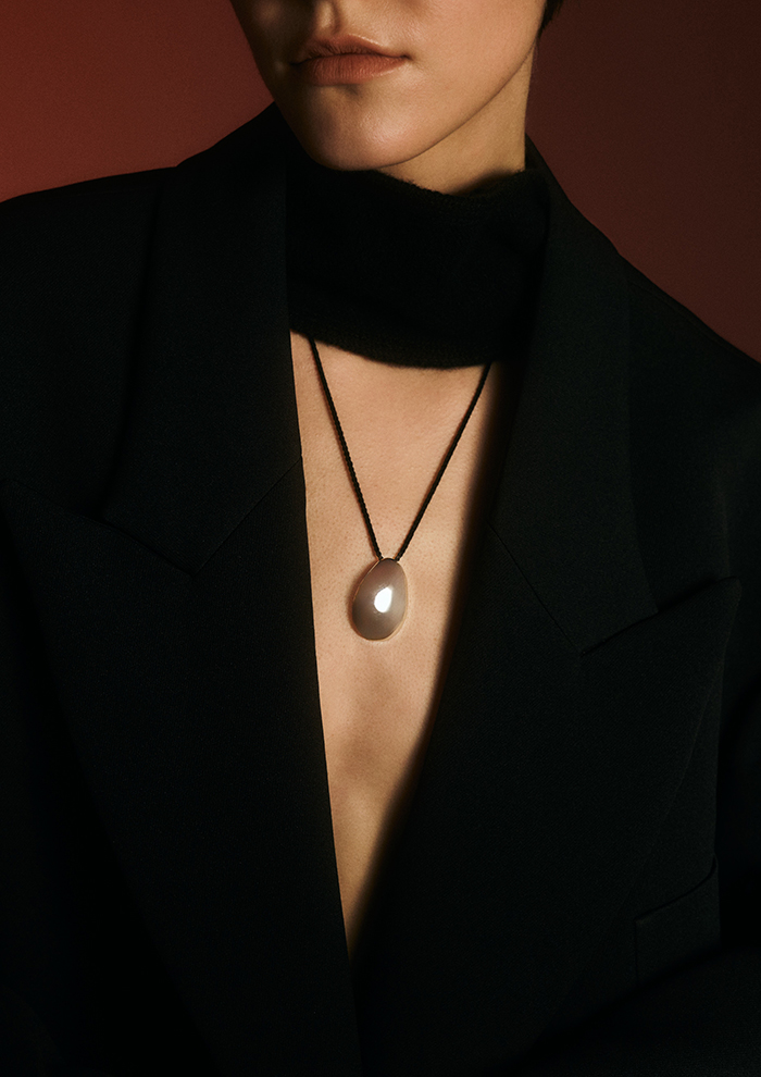 「卵を思わせる楕円形からは生命感があふれ、首元に豊かで満ち足りた印象をもたらします。黒のシルクコードは自在に長さを変えることが可能。長めに垂らして重心を下げれば、よりモード感が高まります」。
