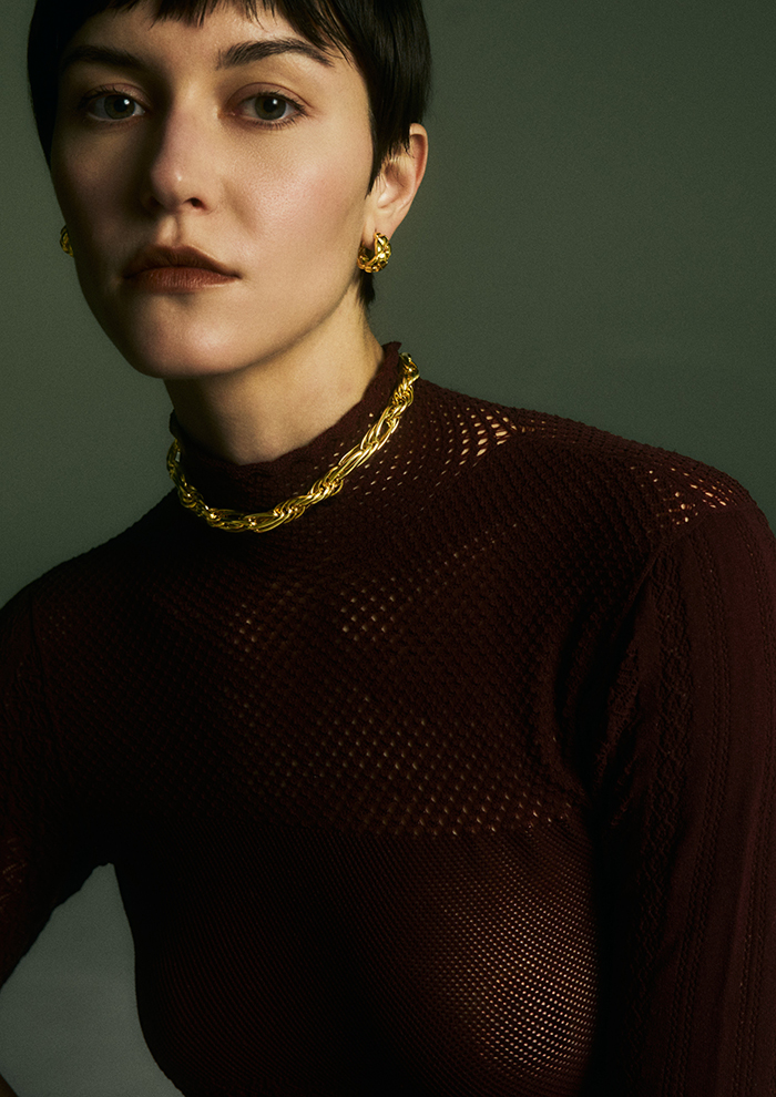 「螺旋を示す“spiral”の名のとおり、複雑に曲線が絡み合うさまが、モードな顔まわりを実現。落ち着きのある質感で、風格がありながらも切れの良い見た目を保てます。オールブラックやジャケットなど、マスキュリンな格好に添えれば目新しい印象に。チェーンが何重も連なることで奥行きが出て、リッチでコクのある見た目を演出できます。首元に沿うコンパクトなサイズも、高貴な華とスマートさを両立。レースやチュールといったシアーなトップスの引き締め役にも◎」。
