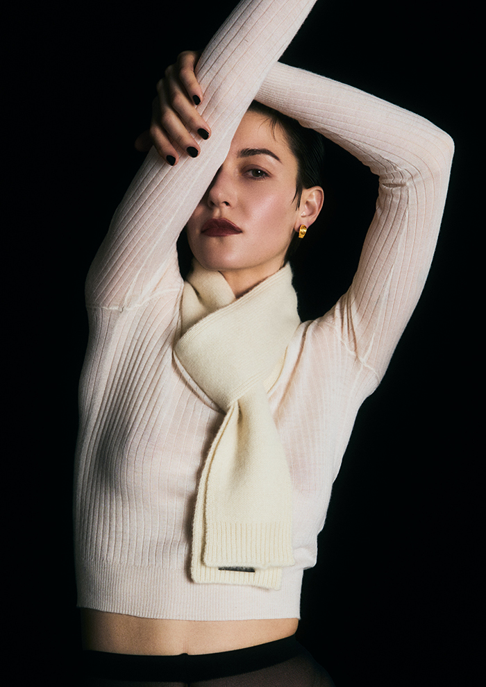 「カシミヤ100%の生地は、肌当たりがなめらかで軽やかな着心地。シアーな見た目は上品な抜け感を醸し出します。メタリックジュエリーが引き立つよう、ボディラインに沿いすぎず離れすぎずの絶妙シルエットに」。