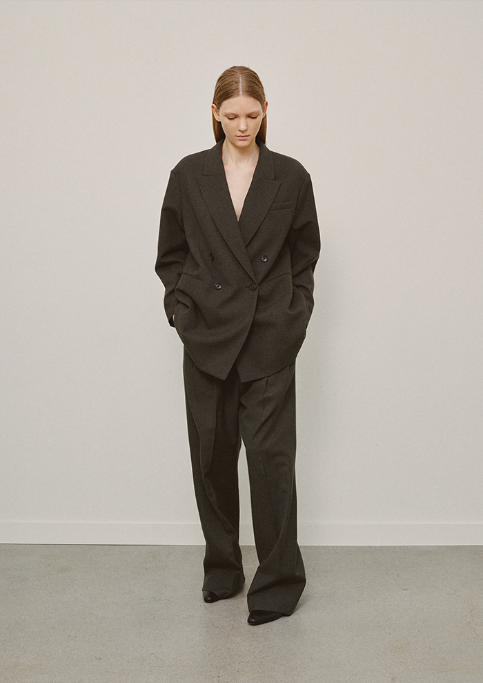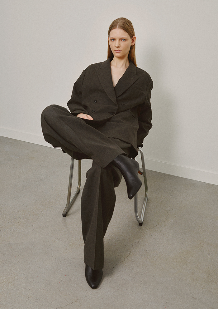 「まずは、ウールのウォーム感、肌触りの柔らかさを残しつつ、メンズライクなハリ・コシが特徴的なダブルブレストのジャケットコートから。メンズのスーツ素材を使用し、「イロット」らしいゆるさと立体感のあるボックスシルエットを兼ね備えたマスキュリンなテーラードです。日常から特別な場面まで寄り添うシーンレスなデザインは、ニュアンスカラーがアクセント。ブランドを体現するタイムレスな逸品であり、ぜひ一度身にまとっていただきたい一着です」。