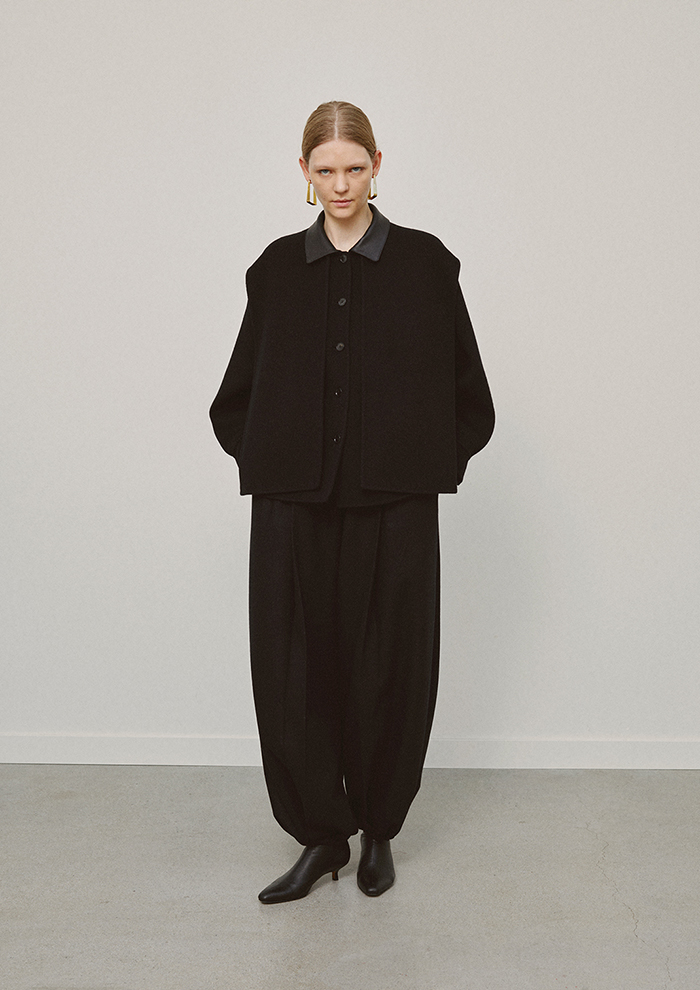 「ストールのようなデザインが象徴的なリバー仕立てのウールシャツジャケット。二重織りのウールビーバーを使用し、シャツジャケット感覚で羽織れるしなやかさと軽さが魅力です。襟部分は本革で仕立てており、遊び心とギミックが加わったモダンなデザイン」。
