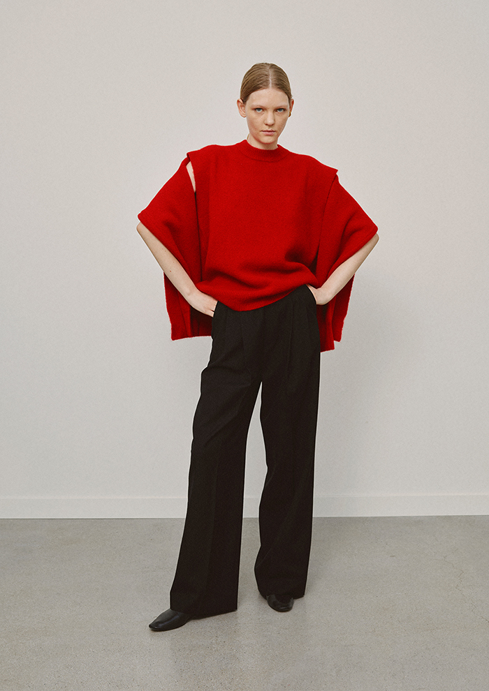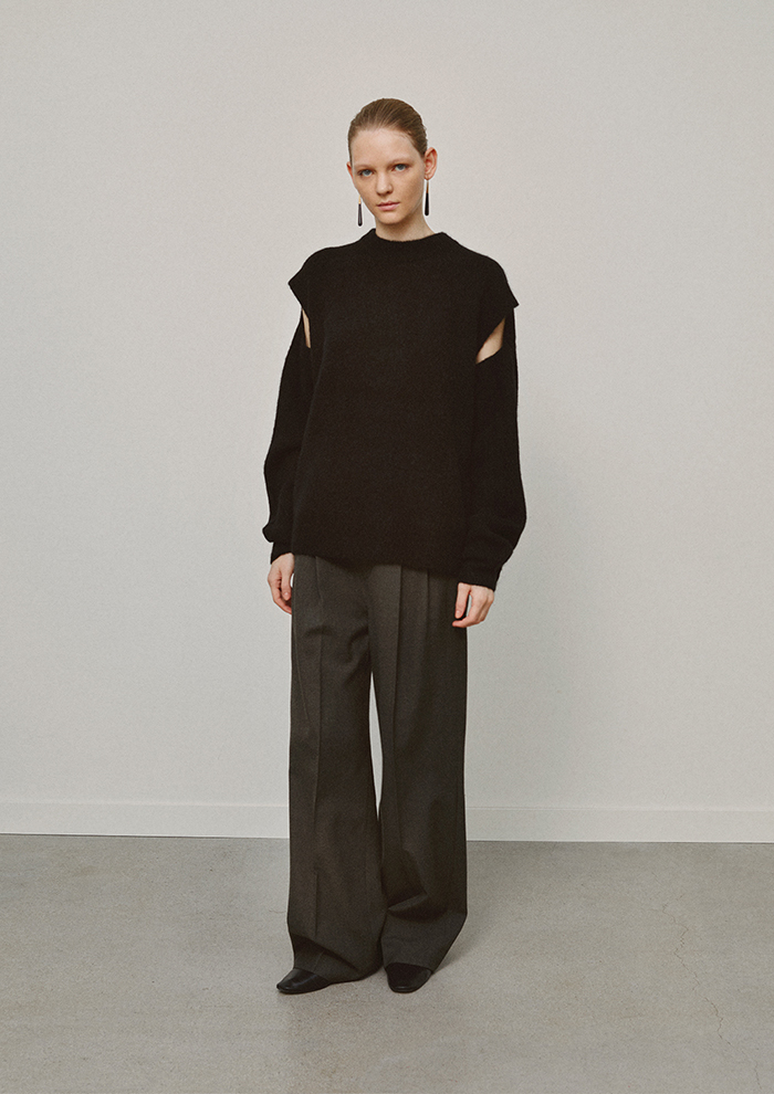 「アルパカブレンドの糸を起毛加工したギミックニットは、袖部分に切れ込みの入った構築的なデザイン。肉厚なニットの柔らかなボリューム感が合わさり、上品な風合いとコンフォートさはそのままに、遊び心のあるスタイルを叶えます。袖を通して着るのはもちろん、ノースリーブで着用したり袖部分を肩に掛けたりと、気分に合わせて自由に着こなせるアイテム」。