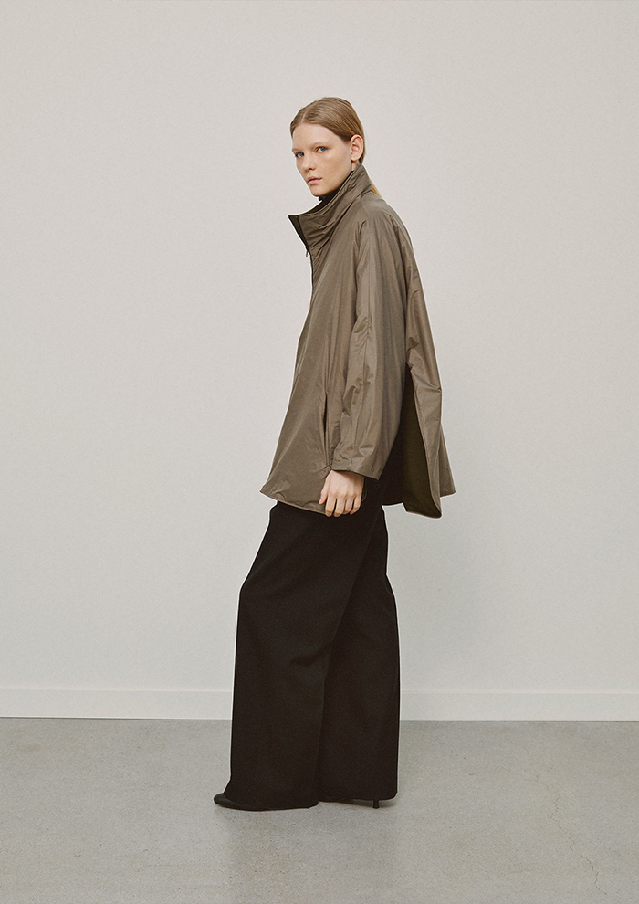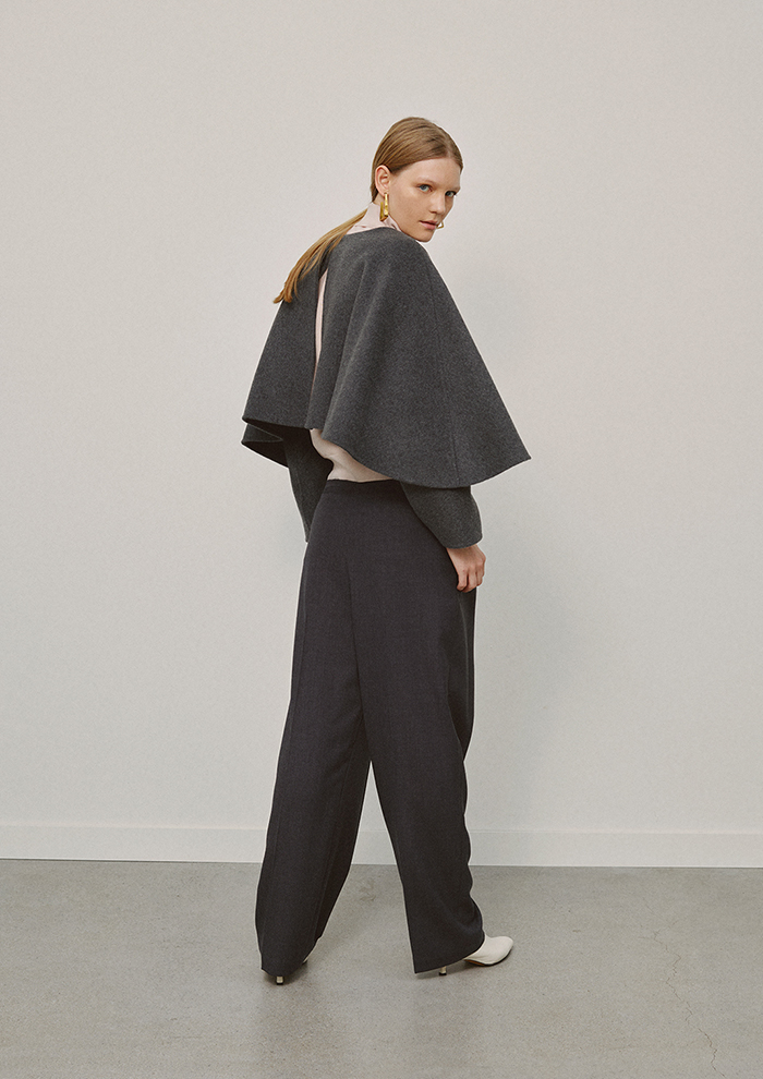 「こちらは、華やかなドレープが美しいケープコート。二重織りのウールビーバーを使用した、しなやかな肌触りとしっかりとしたウォーム感に包み込まれる着心地です。コンパクトながらデザイン性を兼ね備えた、美しく表情のあるシルエットを楽しんで」。