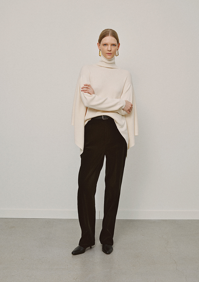 「ドレープの動きを追求し、立体的な構築美を表現したニット。リラクシングな軽い仕上がりは、日常のあらゆるシーンに溶け込む実用性とぜいたくさを調和させた、今シーズンを象徴するアイテムです。サイドにドレープが流れるデザインが、どこから見ても美しく表情のあるシルエットを実現」。