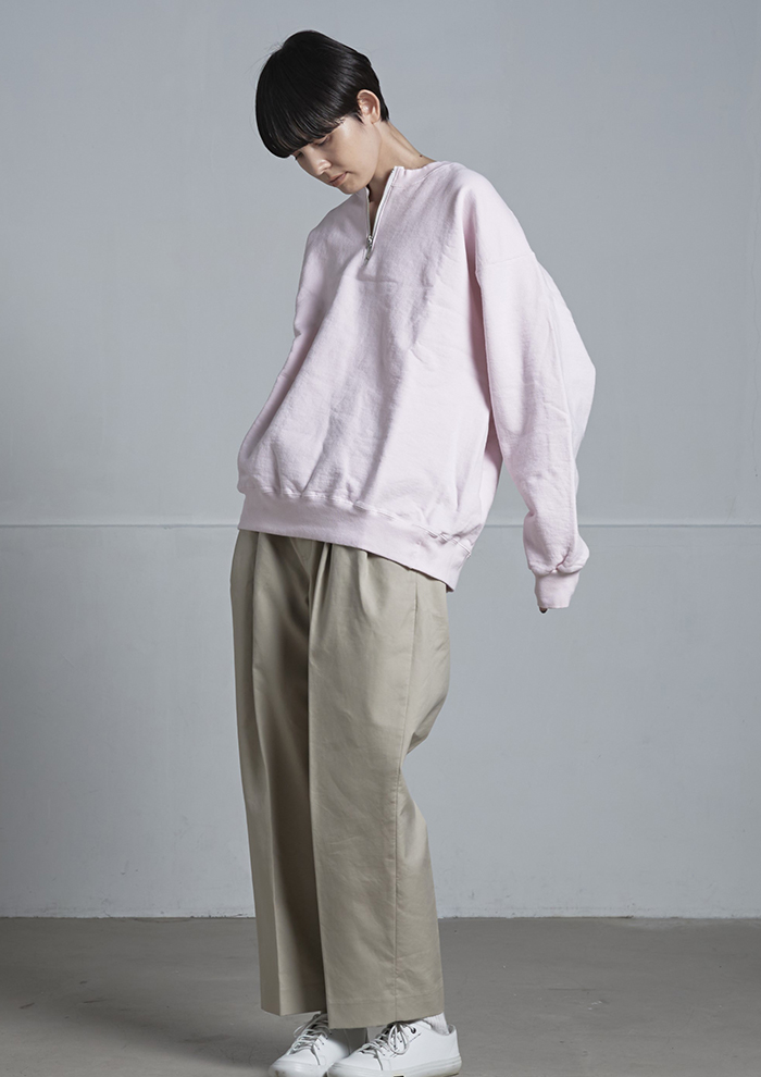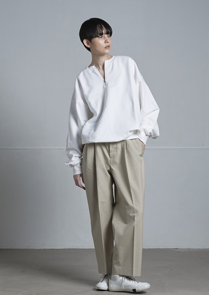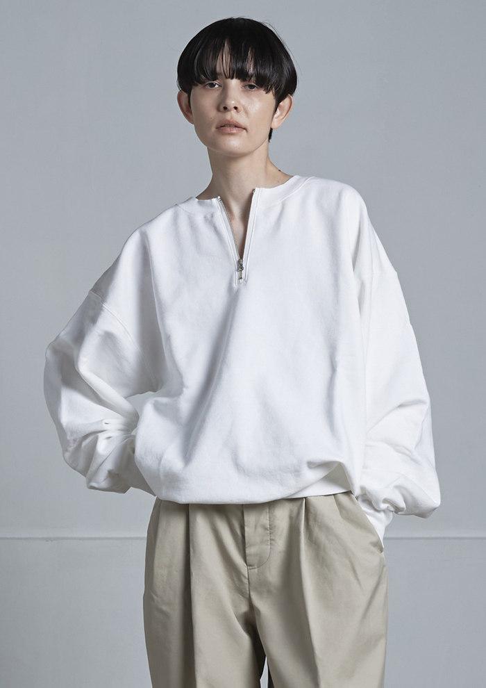 「まずは、これからの季節に心地よく寄り添う、ゆったりとしたシルエットのスウェットから。胸元のジップがほどよい抜け感を演出し、カジュアルながらも上品な雰囲気で着こなせます。柔らかな素材感で着心地も抜群。シャツやタートルとのレイヤードも楽しめ、秋から冬にかけて幅広く活躍します」。