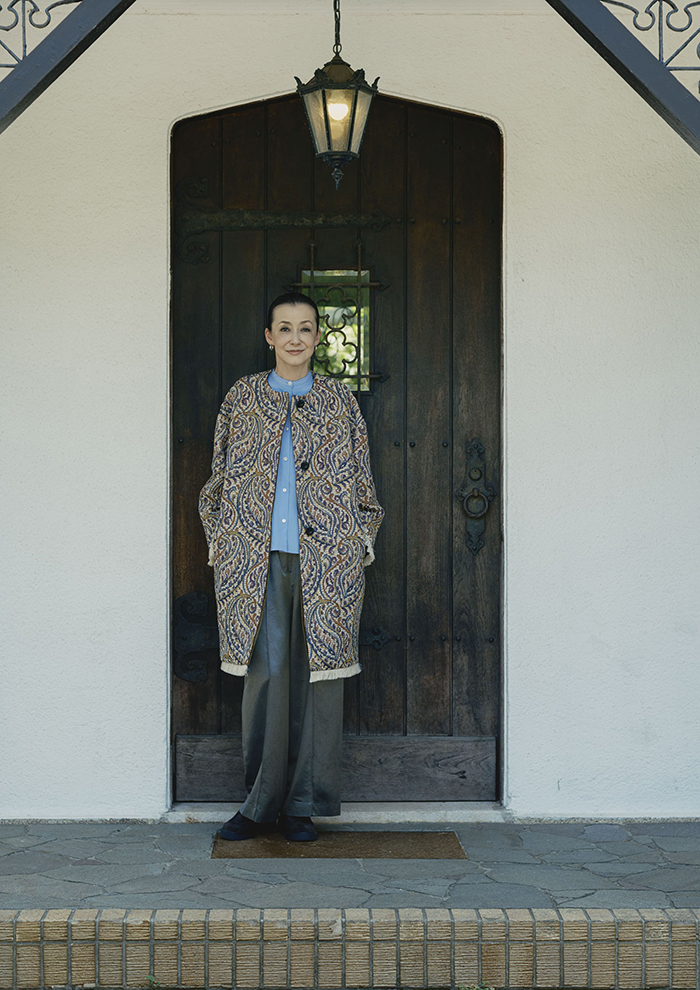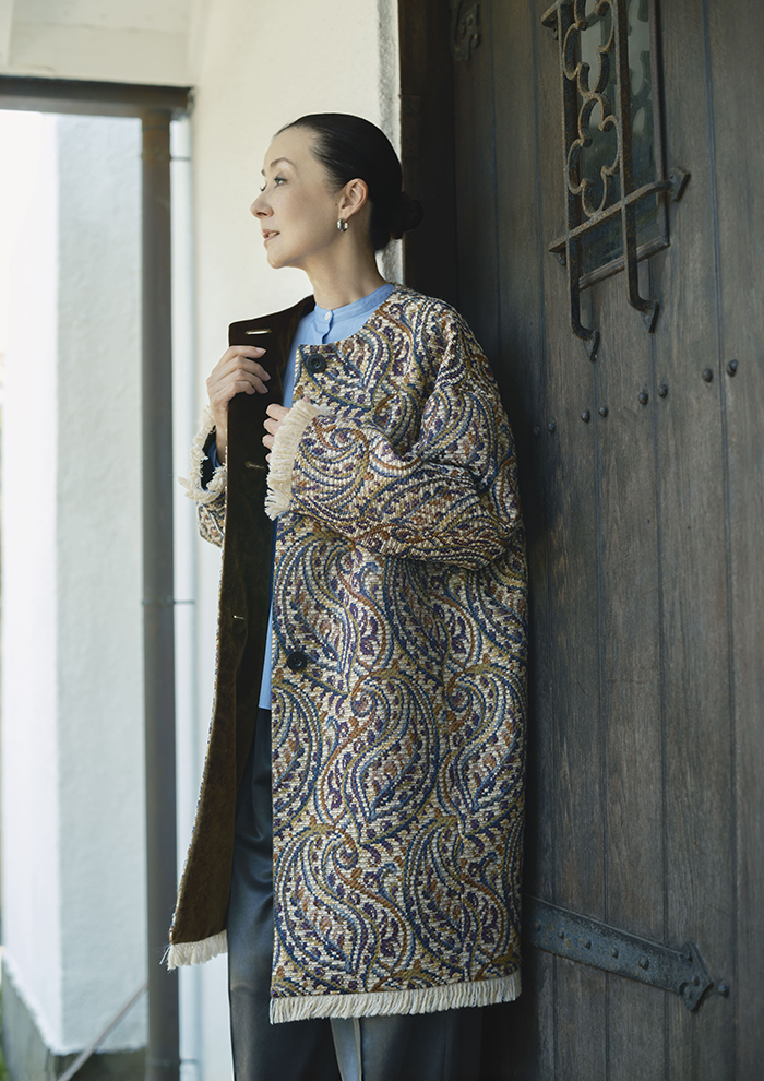 「まずご紹介するのは、今シーズンを象徴するジャカードのコート。タテ糸に細番手のカラー糸、横糸に毛糸のような起毛感のある糸を使用し、ペイズリー柄を表現。深みのある色彩がまるでアートのような奥行きを感じさせます。見返しには美しい光沢のベロア、袖口と裾にはフリンジをあしらい、さりげないアクセントに。代々受け継がれてきたビンテージの雰囲気を、モダンで洗練された着こなしにアップデートしています」。