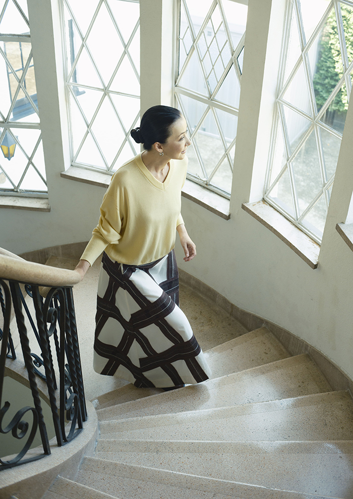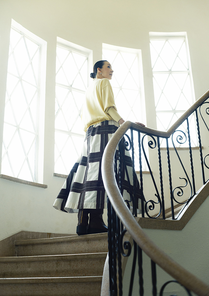 「インドでいちから作成したオリジナルの生地は、チェックジャカードの上から異素材のテープを叩きつけ、それをほぐし、手の込んだクラフト感のある仕上がりに。どの角度から見ても抜かりないドラマチックなフレアシルエットが甘さを抑え、エレガントな印象に。スカートが主役になるようにトップスはシンプルなVネックプルオーバーで引き算コーディネート」。
