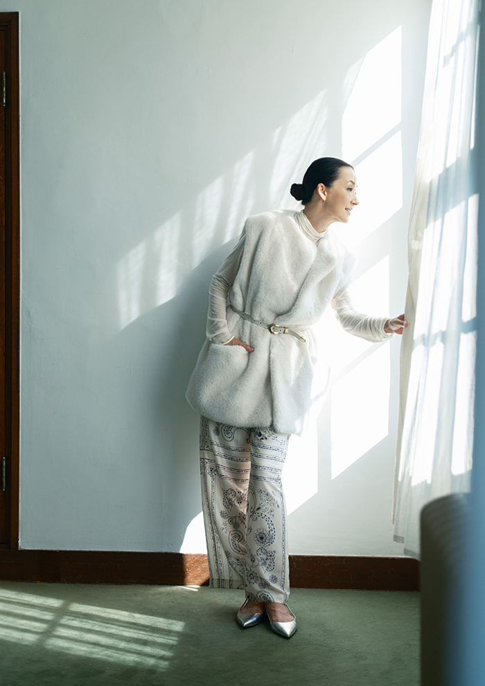 「あたたかみのあるファーとシアーなトップス、繊細なタッチのスカーフプリントパンツをオールホワイトでまとめた着こなし。間延びしないように異なる素材をミックスして、ウエストはベルトマークを。立体感が宿り、華やかさも両立できます。足元にはメタリックなシルバーのシューズで艶めきをプラス」。