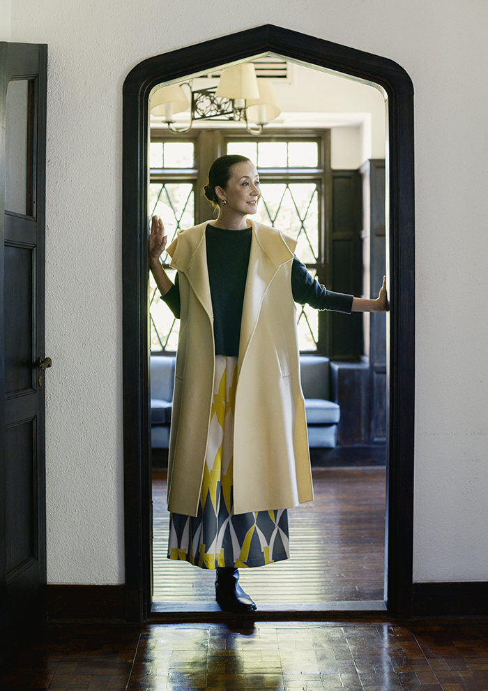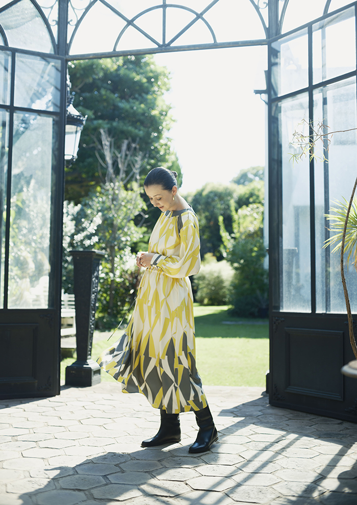 「先ほどご紹介したスカートと同素材でワンピースも展開。どこかノスタルジックな雰囲気が漂うジオメトリック柄をパネル状にプリントしています。ウエストのドローコードでシルエットの調整も自由自在。ウエストを絞ってエレガントに、そのままだとリラクシーに、ニュアンス違いの表情が楽しめます。上に羽織ったのはバイカラーのジレ&ショートコート。丈違いのアウターレイヤードが着こなしの鮮度アップにひと役買って」。