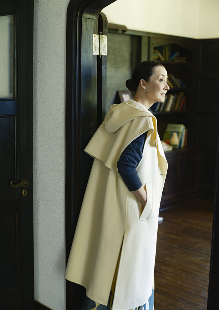 「さっと着られる軽めのアウターとして注目のジレコート。本格的な厚手のコートが必要となる前から長く活躍してくれます。上質なウールにシャルム加工の高級起毛仕上げを施し、しなやかでドレープ性のある質感に。あえてのフードデザインにすることで抜け感のあるエフォートレスな着こなしが叶います」。