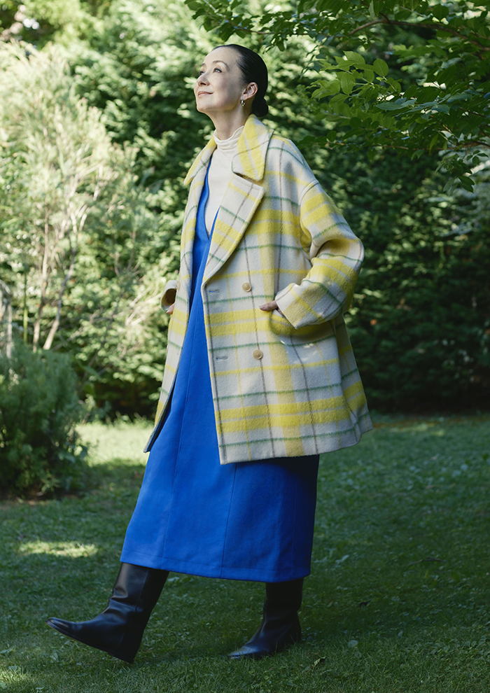 「上質なブランケットに包まれているような軽やかであたたかみのある着心地が魅力のダブルコート。ウール・アルパカ混のシャギーチェックは、ライトベージュをベースにイエローとグリーンが華やぎを与えてくれます。ラピスラズリを思わせるブルーのワンピースでスパイスを」。