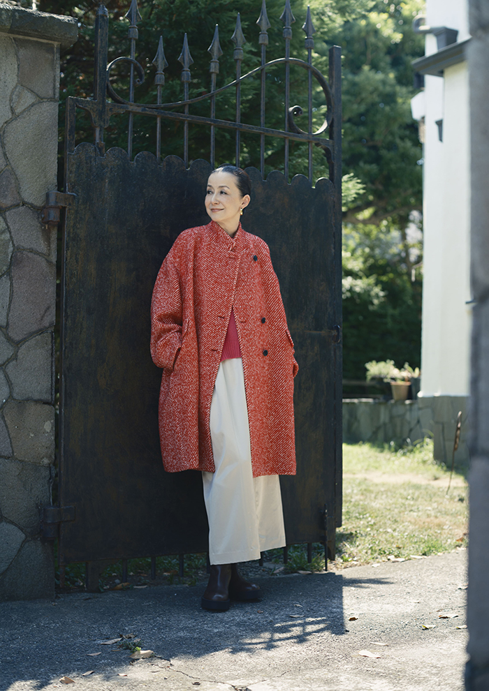 「クラシックなイメージのチェスターをモダン&リラクシーにアレンジしたテーラーコート。膨らみのある太番手のループ形状の糸を使い、「ハウス オブ ロータス」だけの別注カラー、赤×オフホワイトで霜降り調の色味を表現。ピンク×ピンクのレイヤードも軽やかにきまります。フロントはすっきりとしたセットイン、バックはラグランスリーブにすることで着膨れせず、端正なフォルムを演出」。