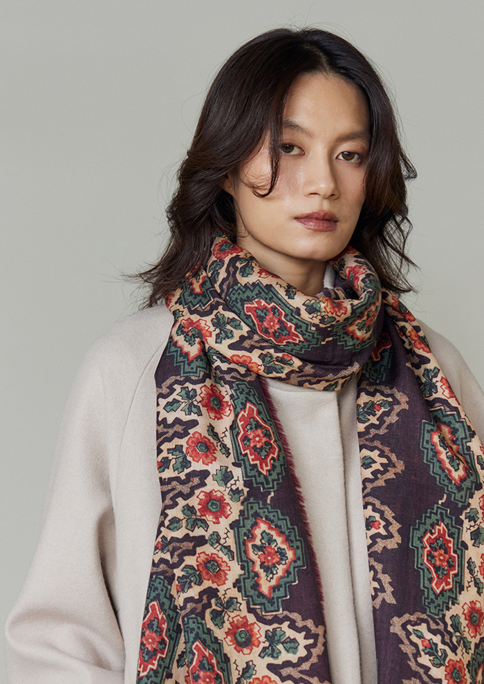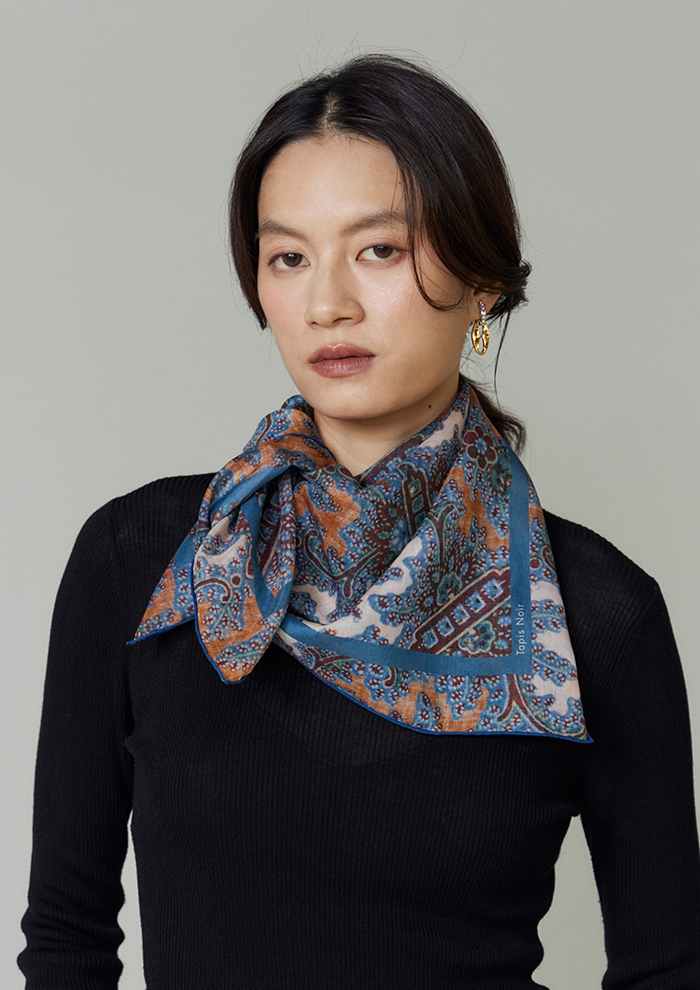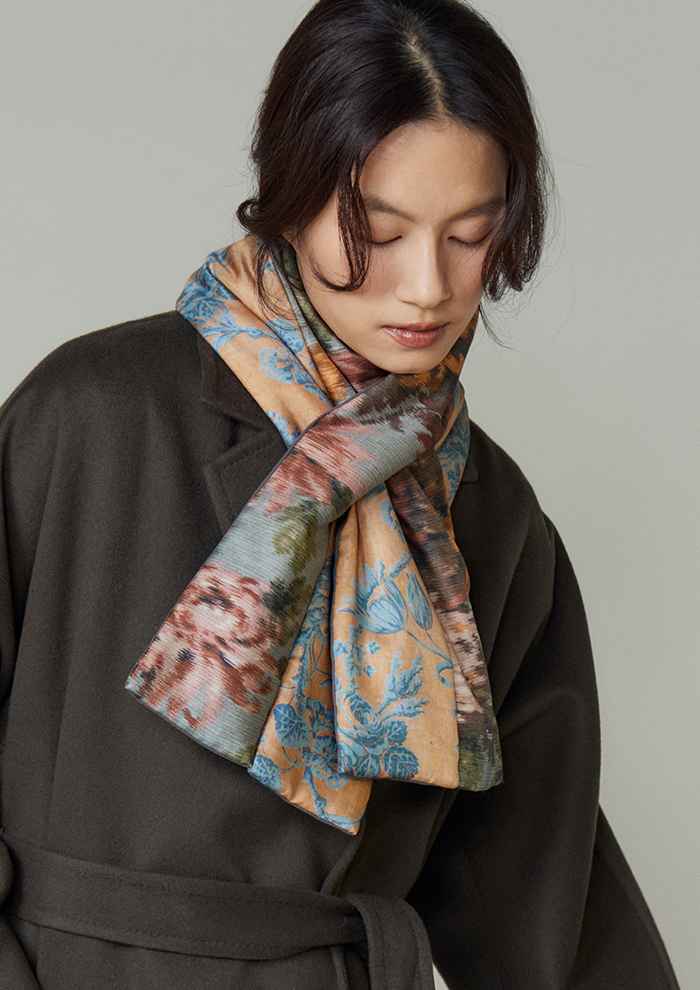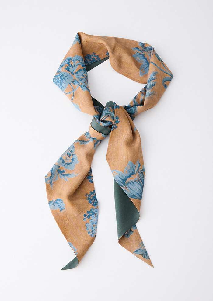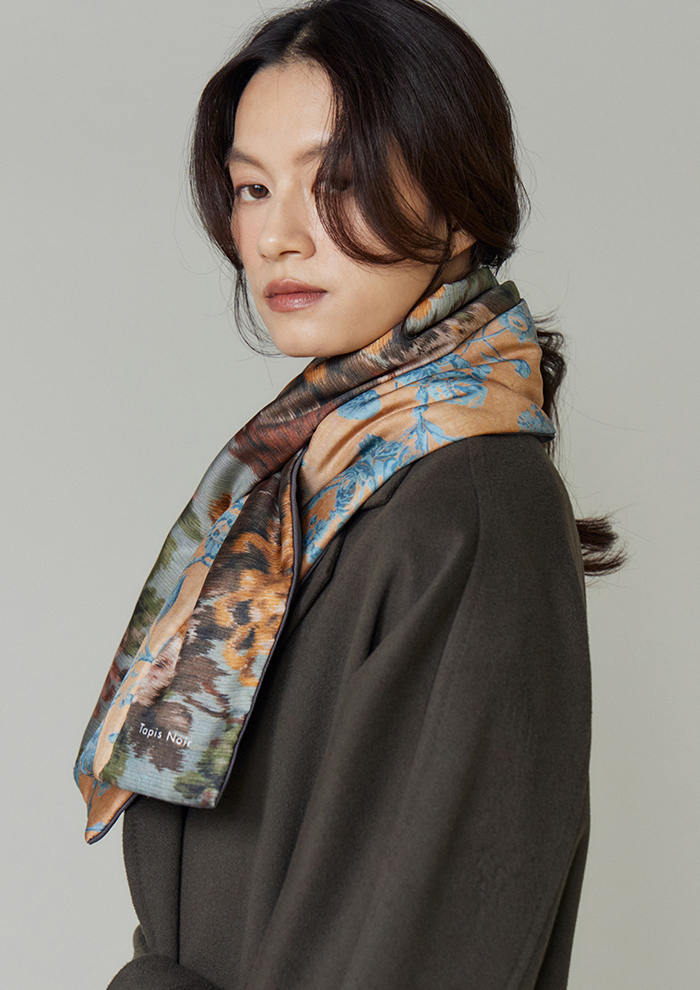 「スカーフに使用するプリントは、長年かけて収集し、いまも増え続けているアンティークテキスタイルのコレクションを中心に、ヨーロッパの18~19世紀の織物やタペストリー、壁紙、装飾パネルからインスピレーションを得て、モダンに再構築したもの。デジタル技術で変換したオリジナル生地を用い、シルクスカーフに特化して、熟練の職人とともに製作しています。“アーツ・アンド・クラフツへの敬意”がフィロソフィー。スカーフには補修跡や時代を感じさせるディテールまでもプリントし、独特の質感や織りの表情もデザインの一部にしています。ひと柄ごとに歴史や物語を宿していることが「タピ ノワール」の大きな魅力です」。