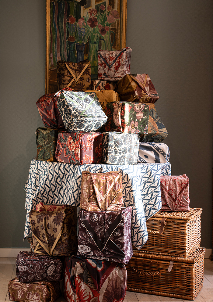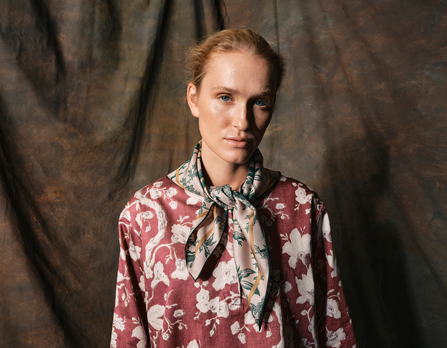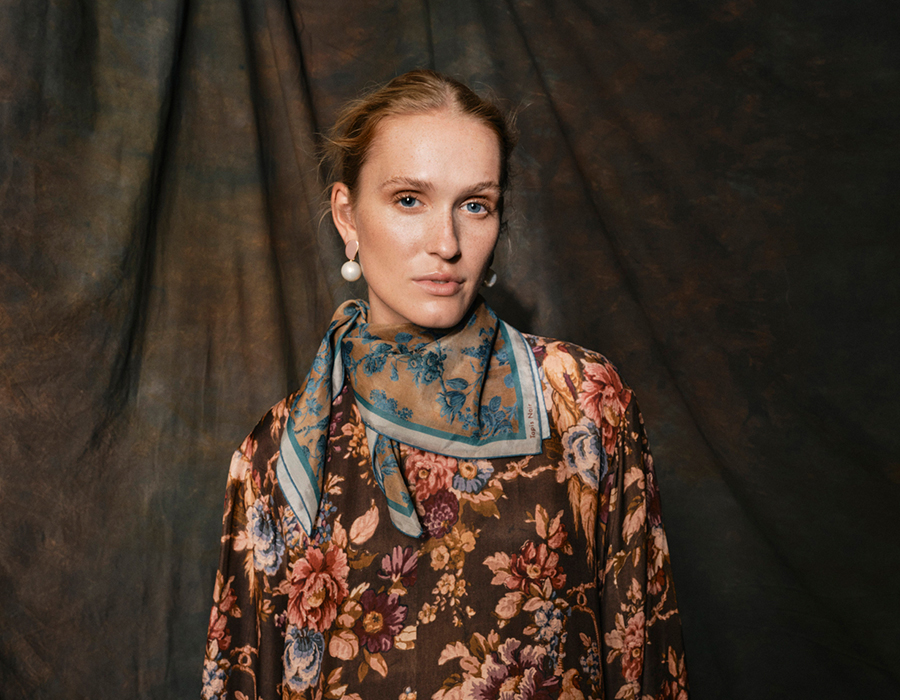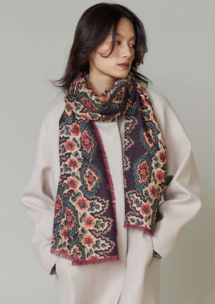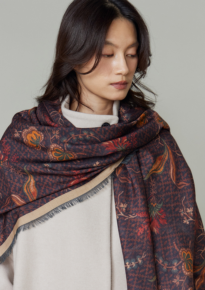 「スカーフに使用するプリントは、長年かけて収集し、いまも増え続けているアンティークテキスタイルのコレクションを中心に、ヨーロッパの18~19世紀の織物やタペストリー、壁紙、装飾パネルからインスピレーションを得て、モダンに再構築したもの。デジタル技術で変換したオリジナル生地を用い、シルクスカーフに特化して、熟練の職人とともに製作しています。“アーツ・アンド・クラフツへの敬意”がフィロソフィー。スカーフには補修跡や時代を感じさせるディテールまでもプリントし、独特の質感や織りの表情もデザインの一部にしています。ひと柄ごとに歴史や物語を宿していることが「タピ ノワール」の大きな魅力です」。