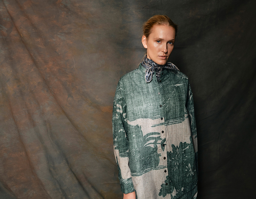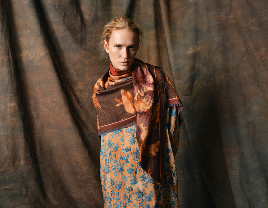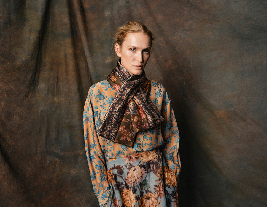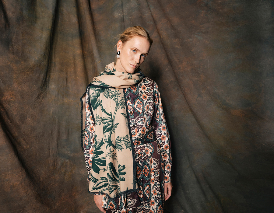 「2025年秋冬コレクションの世界観は、より暗く、深みを帯びた退廃的ムード。濃密なトーンと鮮やかな背景を重ね合わせた、独特の存在感を放つプリントを展開します。インスピレーションの源は、パリの「Hotel Costes」やロンドンの「Park Chinois」に漂う空気感。ヨーロッパのフレンチプリントとインドのペイズリー柄を融合させ、クラシックとエキゾチックが響き合う世界を描き出しています。東洋と西洋の出会いを象徴するデザインが、タイムレスかつモダンな表現を可能に」。