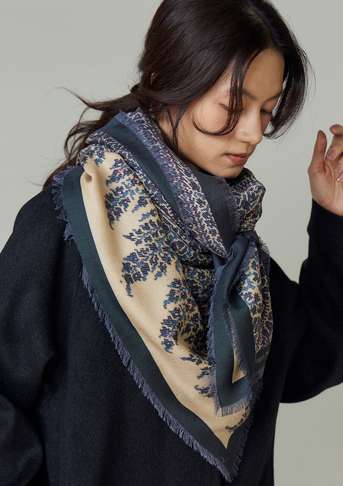 「こちらは“Long”シリーズと同じ素材を用いた、大判で柔らかいウールシルクのスカーフ。正方形の形は三角形に折って首もとに巻くとリッチなボリューム感を演出でき、肩から羽織ればちょっとした防寒対策にもなる優れもの。毎年、秋冬シーズンにとても人気の高いタイプです」。