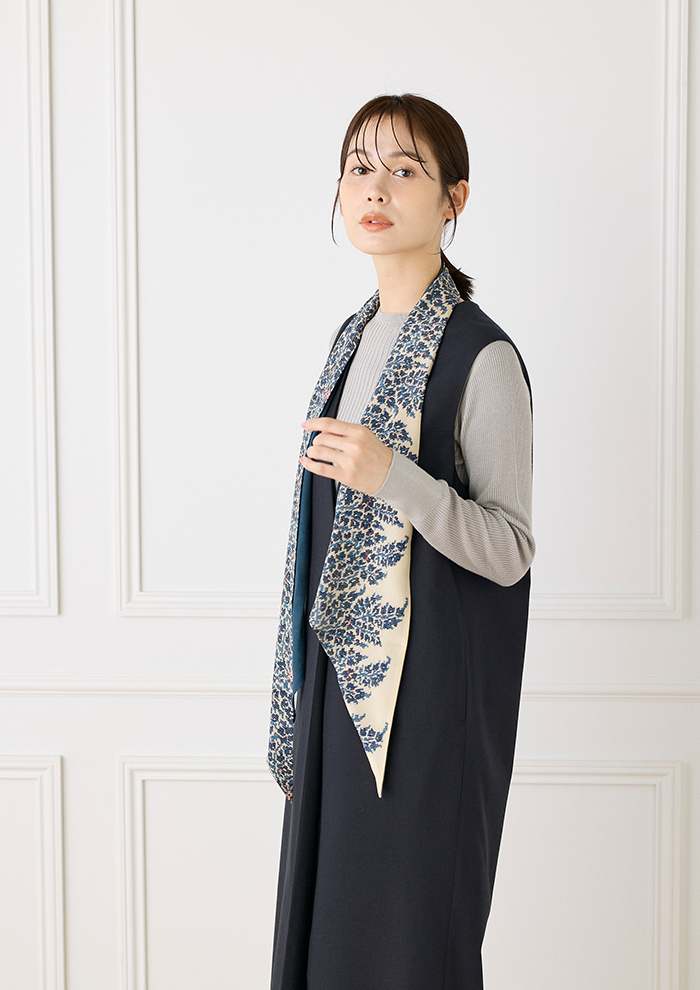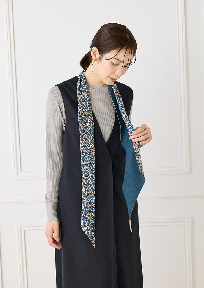 「こちらもシーズンレスで楽しめるアイテム。首元に垂らすだけでも、結んで形を作ってもサマになります。裏側は単色のため、アレンジの仕方で印象チェンジが可能。両端を尖らせた独特の細長いシルエットのため、ベルトのように腰に巻いたり、バッグのハンドルに巻いたりと使い方もさまざまです」。