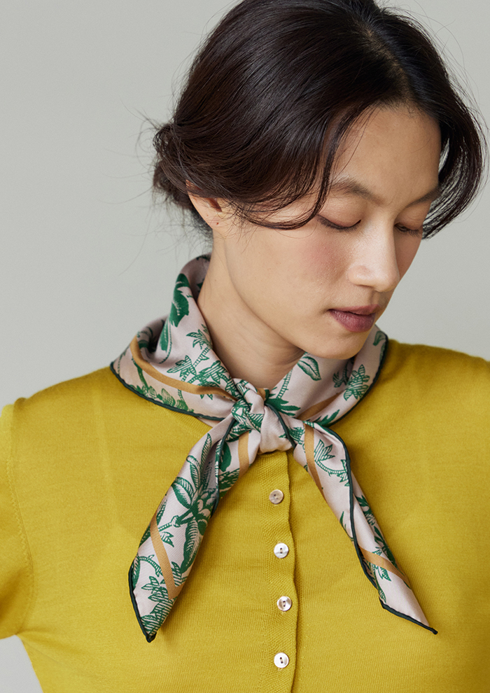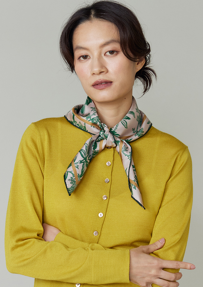 「シルクツイルの光沢感が上品で目を引くスカーフ。特殊な機械で両面を同時にプリントしています。デザイナーのおすすめは、シャツやニットの首元にスカーフをインして柄を少しのぞかせる楽しみ方。現在はミシンによる縫製品が増えていますが、裁断したプリント生地を熟練の職人の手によって縁をかがっていく“手巻き”を行なっている逸品です」。