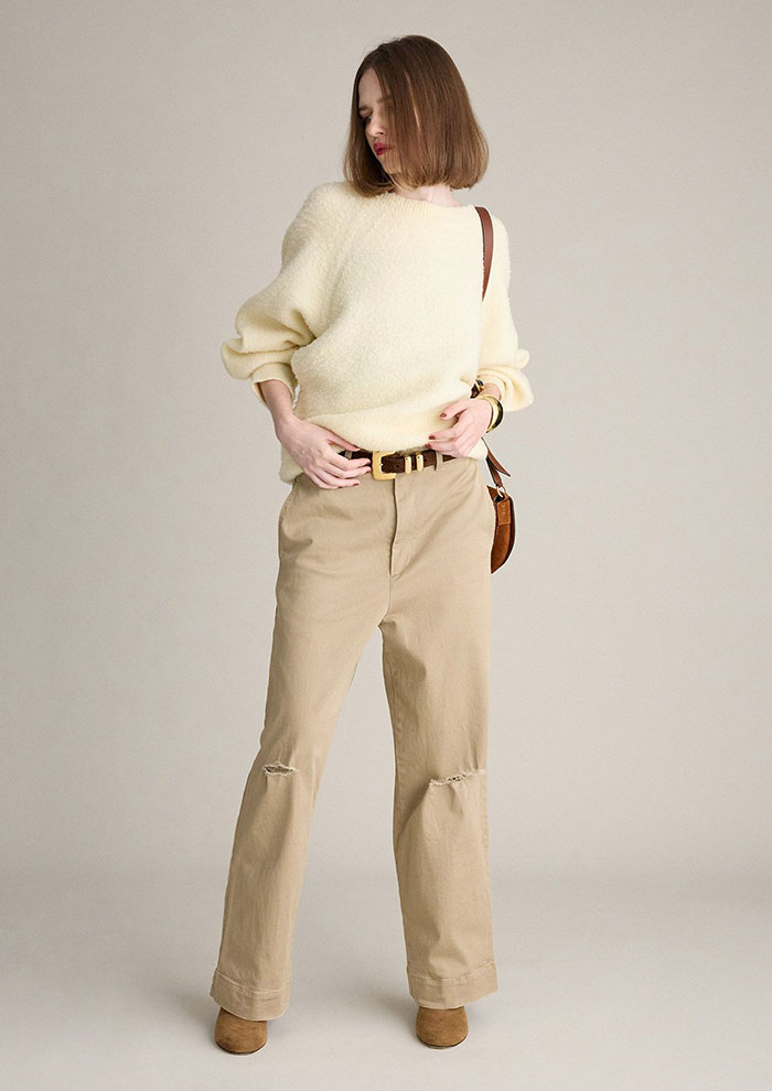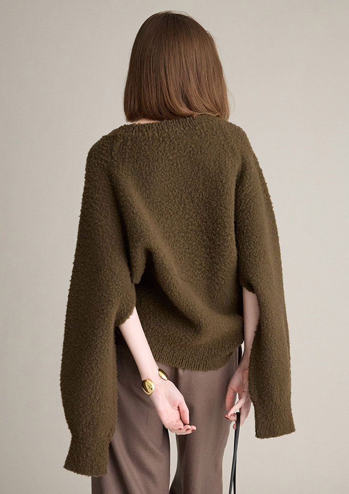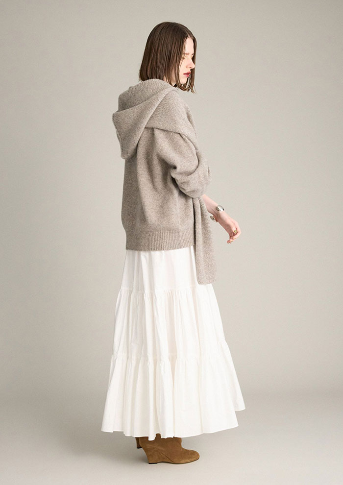 「ふんわりとした空気感と奥行きのある表情が魅力の新作ニットにもご注目を。表面の凹凸感からニュアンスのある陰影が生まれ、シンプルな着こなしに表情が生まれます。袖下から裾にかけての2WAY仕様により、シルエットの変化が楽しめるのもポイント。端境期から長く活躍し、スタイリングにドラマチックなムードをもたらします」。