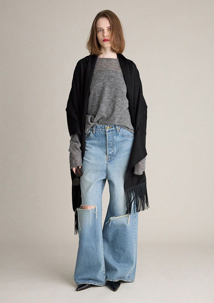 「13.2ozの空紡糸デニムを使用し、不均一な織りによってざっくりとした粗野な表情とビンテージのような奥行きを実現したデニム。人気の5ポケット仕様をベースに、ウエストからヒップにかけてはすっきりと、裾にかけては緩やかに広がるワイドシルエットに仕上げました。はくだけで脚のラインを美しく見せ、洗いや擦りの加工と相まって存在感のある雰囲気に。細部までブランドらしいディテールが光る一本です」。