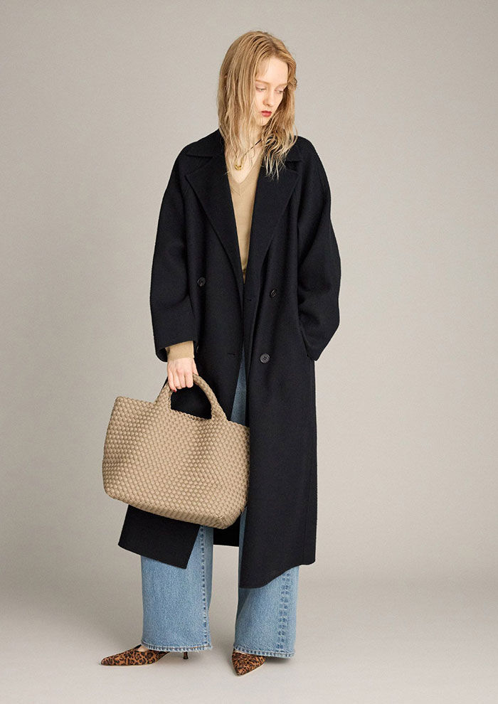 「オープン以来、冬の定番として愛され続ける“カシミミストール”。ストールでありながらフード付きという唯一無二のデザイン。羽織るだけでモードなニュアンスが加わり、スタイルの鮮度アップを叶えます。今季は新色ブラックが登場し、よりシックな雰囲気に。端境期から真冬まで活躍する、大人のワードローブに欠かせない一枚です」。