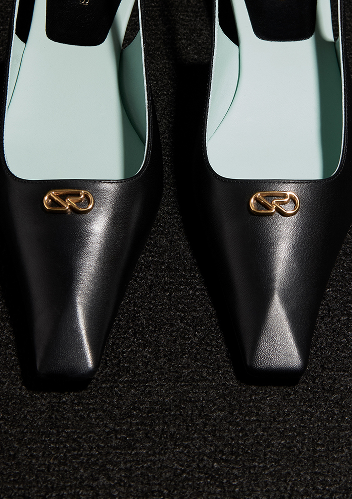 「“情熱とエネルギーをそなえた前進”の意味をこめて名づけた“SURGE”。アッパーにあしらったゴールドのSRモノグラムが、ブランドの新たなアイコンとして存在感を放ちます。パンプスとスリングバックのポインテッドトウにはピラミッドシェイプを施すことで立体感が生まれ、洗練された表情に」。