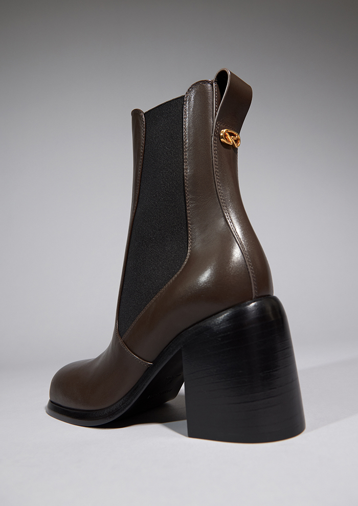 「チェルシーブーツを再解釈し、モダンにアップデートした“AVENUE”。注目すべきは斜めにカットしたサイドゴアのシルエット。スッと足に沿うカットラインの効果で、よりスムーズな着脱を実現します。ヒールは2.5cmと8cmで展開。2.5cmヒールはその合わせやすさと機能性で、デイリーユースに活躍します。8cmヒールはトップにまるみをもたせたチャンキーヒールが印象的。履き口のプルトップには、新生「セルジオ ロッシ」を象徴するSRモノグラムを配し、バックルタイルにもさりげないアクセントを」。
