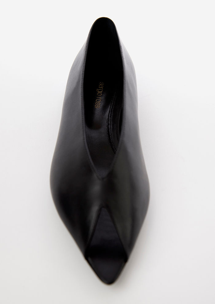 「バレリーナは、ピープトウとアッパーの深いVラインカットの絶妙なシェイプに注目。ポインテッドトウの先の中心からピープトウのカットの中心を2mmほどずらした、指先が美しいバランスで覗く、計算しつくしたデザインです」。
