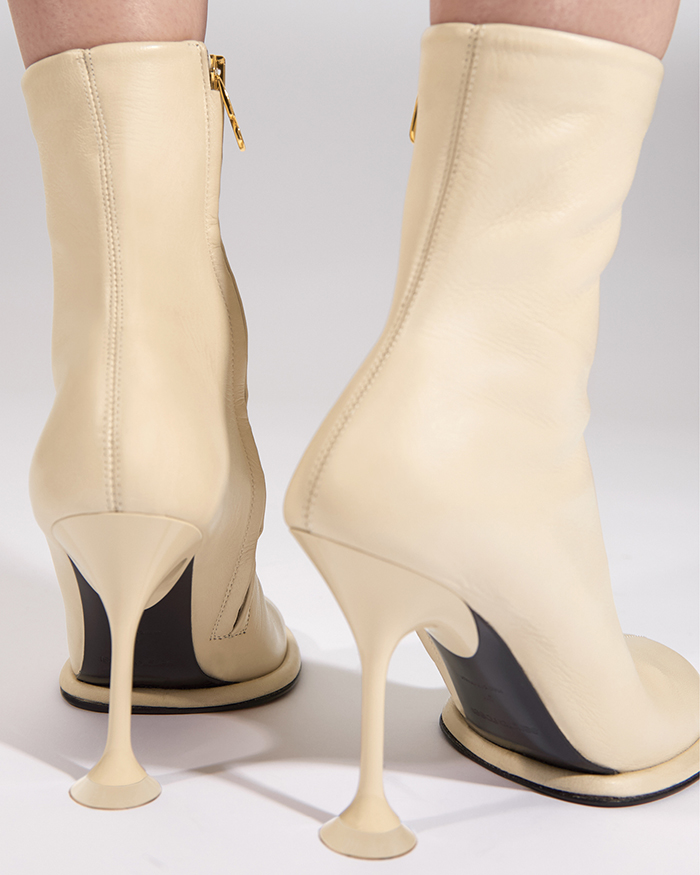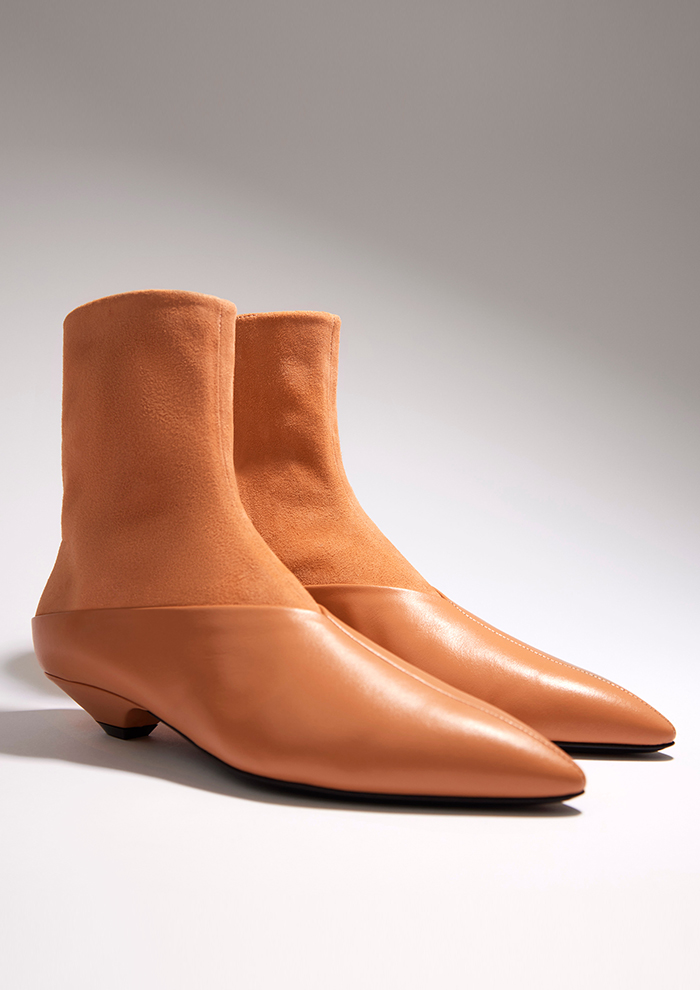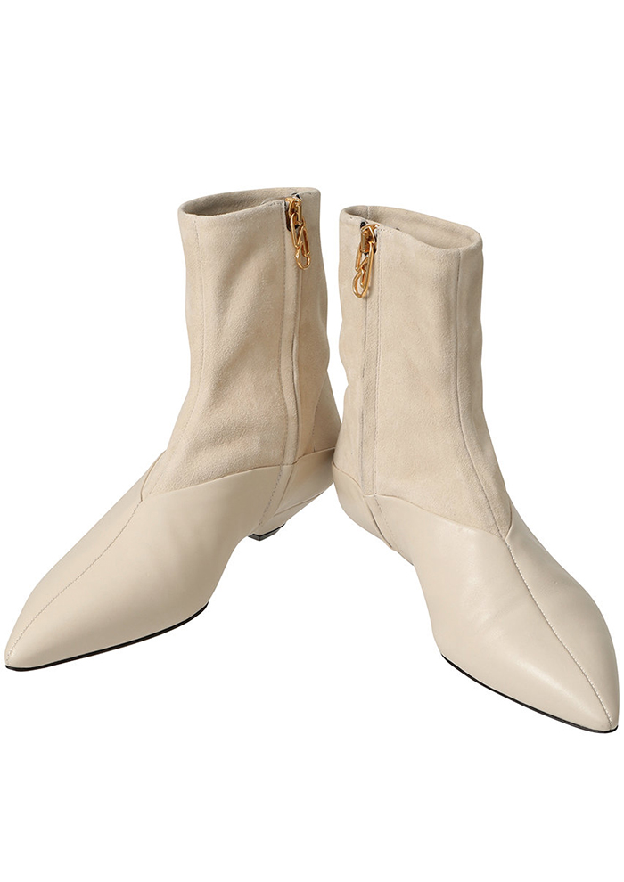 「ストレッチの効いたスエード素材×カーフレザーのコンビネーションのブーツは、まるでソックスを履いたような切り替えしがユニークなデザイン。異なるレザーを組み合わせることで、トーン・オン・トーンでも豊かな表情に」。