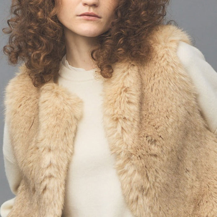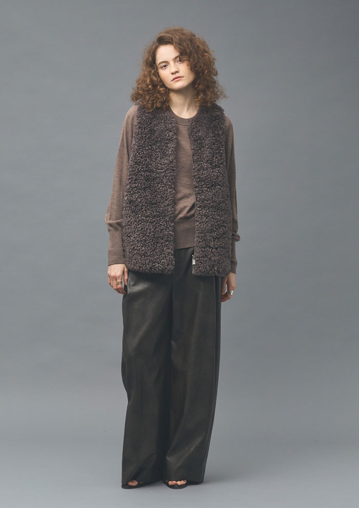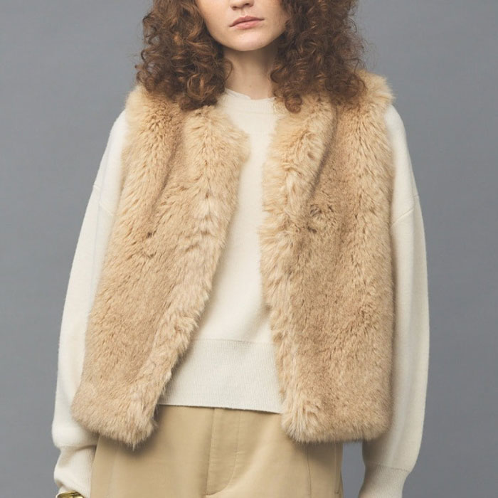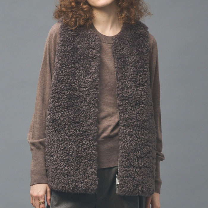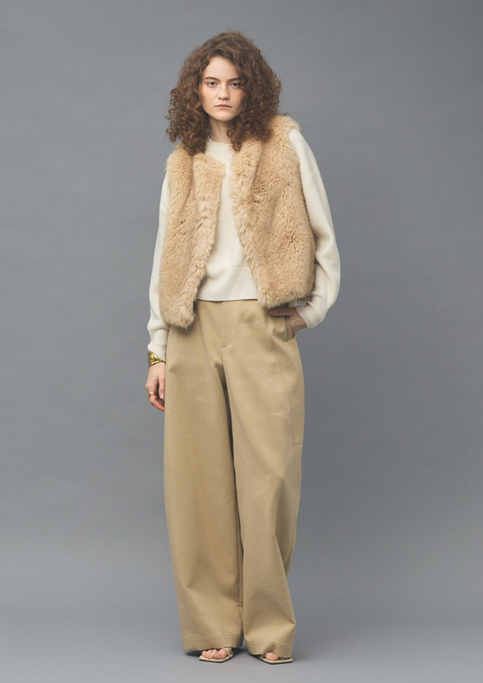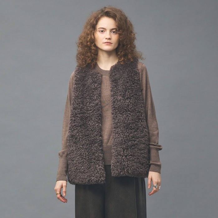 「上質なフェイクファーを使ったショート丈のベストは、毛足が長いリアルファーのような表情が魅力。シンプルなスタイリングにプラスオンするだけでシーズンムードをクラスアップしてくれます。ショート丈なのでボリュームのあるワイドパンツやロングスカートと合わせてもバランスがよく、秋から冬へのスイッチシーズンにも最適」。