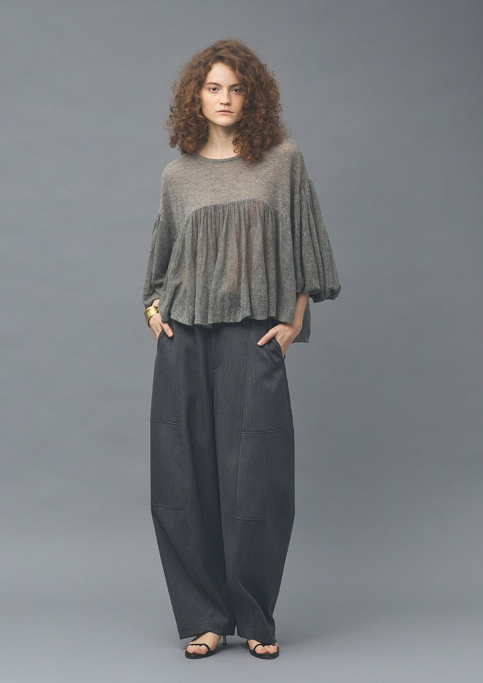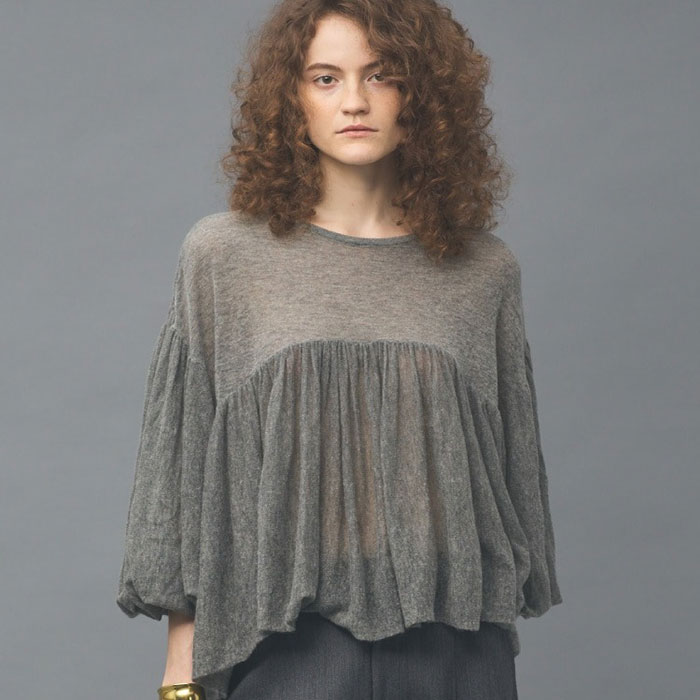 「たっぷりとギャザーを寄せたボリューミーなシルエットで、一枚着るだけでコーディネートの主役になるプルオーバー。薄く繊細に編んだウールとカシミヤ混の上質な糸を使って、軽くエアリーに編み上げています。しっかりとした保温性と温もりがあり、着心地の良さも抜群」。