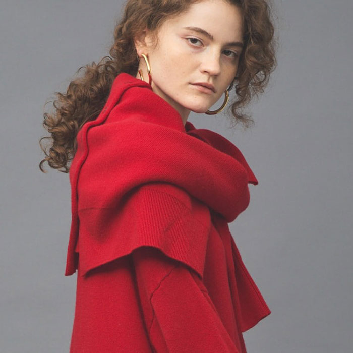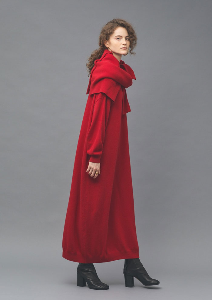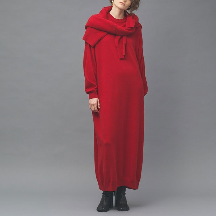 「鮮やかな赤が目を引くワンピースは、ゆったりとした丸みのあるシルエットで体のラインを拾わず、リラックスして着こなせます。ウールとカシミヤをブレンドした、まるで毛布に包まれているかのような暖かさと柔らかな肌触りは手放せなくなること間違いなし。同素材の2WAYプルオーバーをストールのように合わせた、旬なセットアップスタイルもおすすめ」。