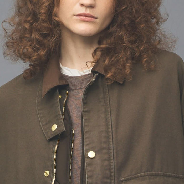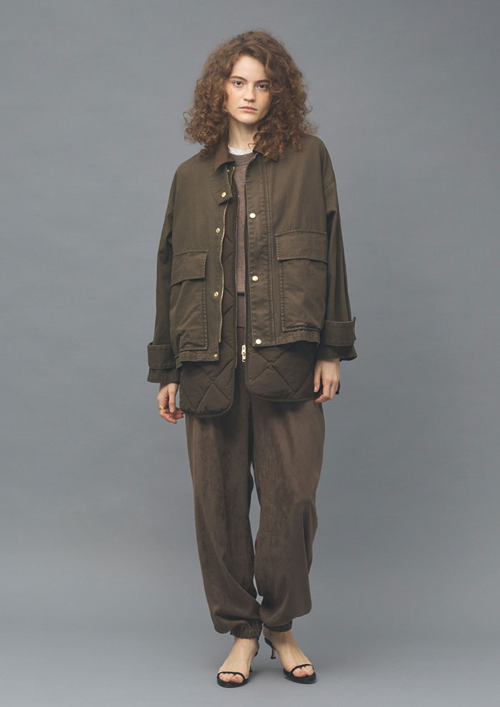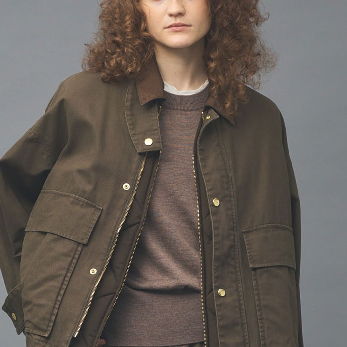 「こちらは、ミリタリー要素とビンテージ感を融合させた、ショート丈のブルゾン。中綿入りのキルティングベストがセットになっており、レイヤードスタイルが楽しめます。ベストはブルゾンの上にもインナーとしても使えるので、さまざまな着こなしが可能。製品洗いで仕上げたビンテージのような風合い、フロントの大きなポケットとゴールドのボタンなど、細部までこだわりつくしたデザインとバランスです」。