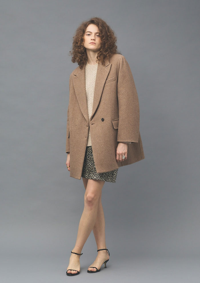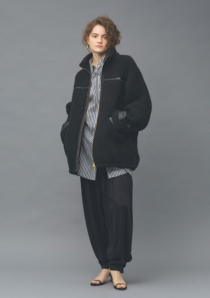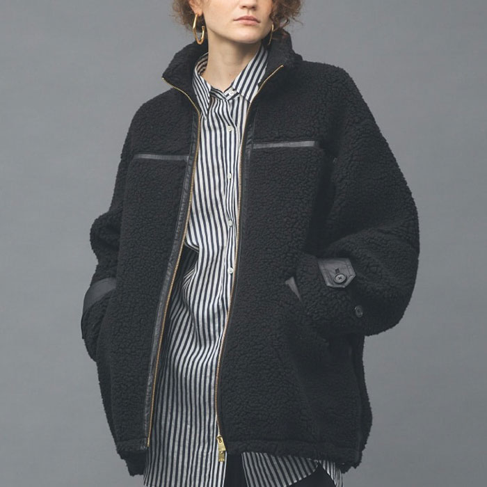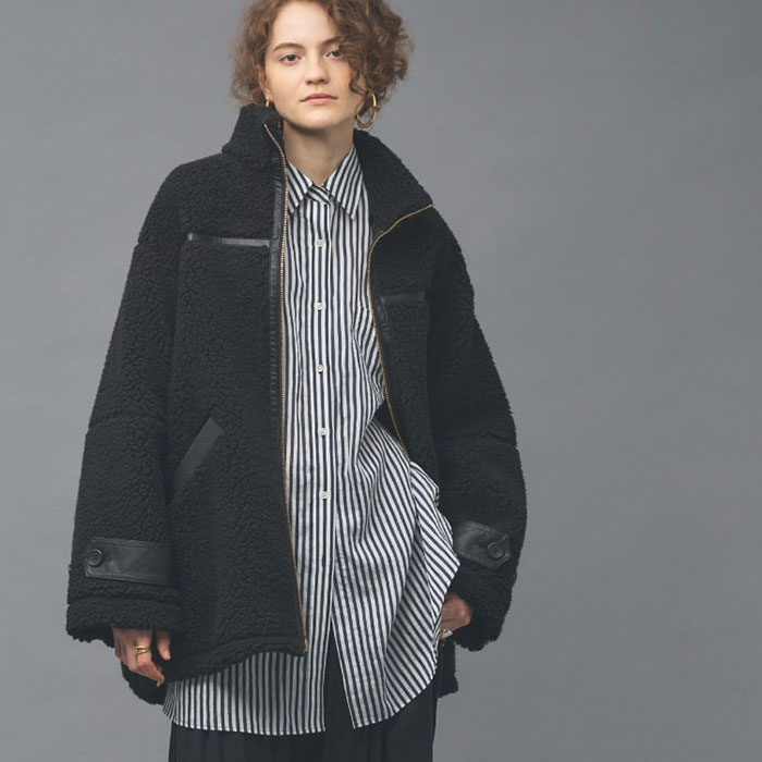「たっぷりなボリューム感が主役級のボアアウターにもご注目を。ヒップが隠れる着丈で冬の防寒対策にぴったりです。薄手のフェイクレザーのテープラインや袖口のベルトがアクセントとなり、カジュアルなボアにクールな表情をプラス。インナーはすっきりとしたアイテムを合わせるのがおすすめ」。