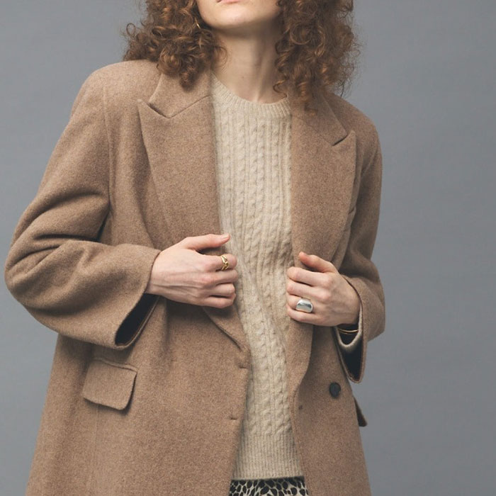 「まずはこの秋の装いに欠かせない、リバーシブルデザインのファーベストから。リアルシープのようなカーリーな毛並みと、肌触りの良い柔らかで上質なフェイクファーの表情が魅力です。裏面にはイタリアの「リモンタ」社監修による上質なキルト生地を用い、異なる表情に。上下どちらからも開閉可能なダブルジップも、着こなしに遊び心をプラスします。シンプルなスタイルに羽織るだけで、ぐっと洗練された雰囲気をプラス」。
