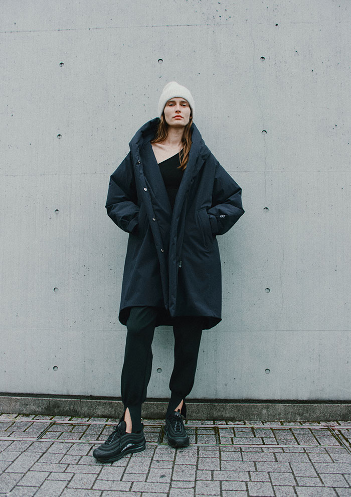 「秋冬はスポーツ観戦や子供の送迎などにも防寒してくれるロングダウンコートが登場。非常に軽いタフタ素材の裏にポリウレタン膜をラミネートすることで、雨や汗に強い防風・防水の機能を持たせた2レイヤー素材で仕立てています。大き目の重ねフードで首まわりも暖かく、小顔効果も。袖や背中のLE PHILロゴがアクセントに」。