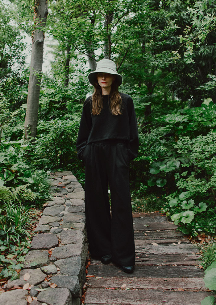 「リラックス感と機能性を両立したスウェットセットアップ。肌に触れる内側は何度も起毛を重ねた柔らかな裏毛素材を使用しています。毛布に包まれているかのようななめらかなタッチで、長時間の着用もストレスフリー。ショート丈トップスは身頃と袖部分を異素材で切り替えてデザイン性と立体感を持たせています。パンツはウエストゴムで、内側のドローコートによってサイズ調整可能。適度なゆとりで脚のラインを拾いすぎず、美しいシルエットにこだわりました。グレーとブラックの2色展開」。