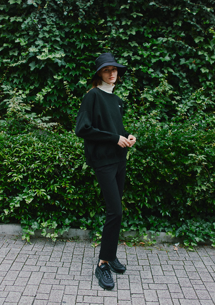 「ダブルネックがポイントのレタードニットが登場。高伸縮性のあるポリエステル糸で仕立て、メンズのXLサイズを着たかのようなシルエット感に。レギンスなどと合わせて、ゴルフや日常使いにも。合わせたバケットハットは、上質なモールスキン素材を使用しています。長めに設計したブリムがシャープな印象で、取り外し可能なブランドロゴのピンズ付き」。