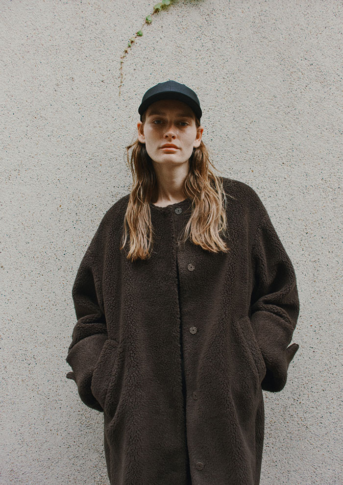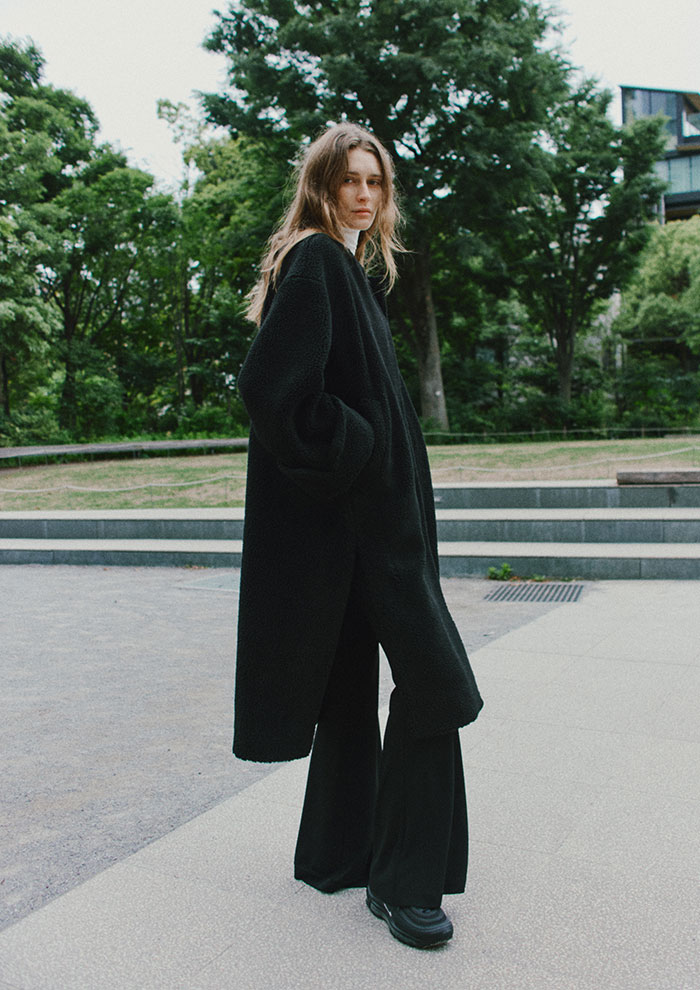 「裏地に特殊な起毛加工を施したメッシュ素材を使った保温性の高いボアコート。ボアコートは見た目に反して暖かくない……その悩みを解決してくれるロングコートです。手触りの良いボア素材は着心地抜群。前後差ある丈感とスリットによって、どんな身長の方にも合います。袖の大き目の折り返しがデザインポイント」。