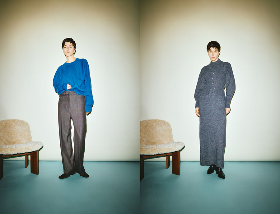 「なめらかなカシミヤ混コットンを用いた、やや肉厚のニットトップス。立体的なフォルムと内側にカーブを描いた肩線のデザインが、シンプルなワンツースタイルでも無難にならない着こなしに。一方、ホックのデザインが印象的なニットビスチェを付属したニットドレスは、ほどよく体にフィットし、女性らしいシルエットを演出できます。Iラインドレスは、ドレス単品でも汎用性抜群。コジーな冬スタイルを楽しんで」。