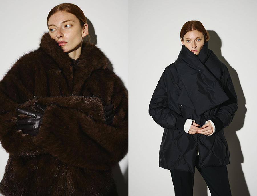 「毛足の長いフェイクファーのジャケットは、ルックスに反した軽い着心地が特徴。存在感のあるアウターながら、バランスの取りやすい着丈やシルエットにこだわった設計です。中に着込めるゆとりもあり、首までしっかり暖か。シックなカラー展開も魅力です。そして、「リムアーク」で毎年安定した人気を誇るダウンコートは、共生地のストールをセットにしたコンパクトな着丈で登場。マットな生地感とすっきりとしたネックデザインがカジュアルさを削ぎ落とし、モダンな雰囲気に。ダウンならではの暖かさとバランスの良いシルエットも相まって、カジュアルからきれいめまで活躍します」。