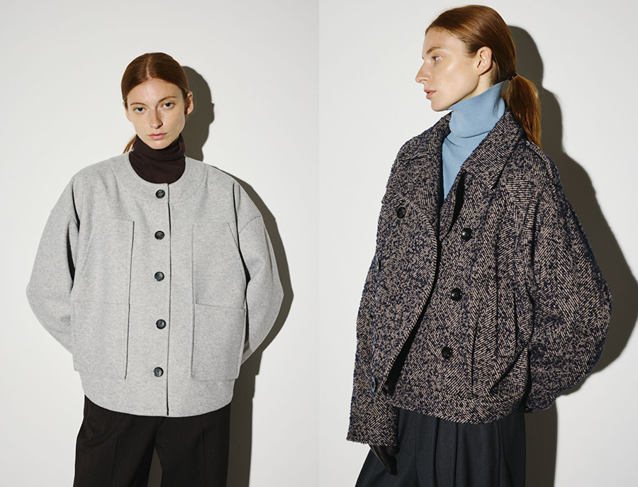 「ニードルパンチ加工を施したウールライクなジャージ生地のブルゾンは、中肉厚で表情のある生地感が特徴。今シーズンのテーマである丸い曲線を描いたパターンは、バックロングのシルエットとすっきりとした首元でバランスの取りやすい設計です。軽く羽織れる洗練されたデザインが、レイヤードにも活躍。ヘリンボン柄のウール混ループツイード生地を使用したオーバーコートは、コンパクトでバランスの取りやすい着丈です。チンストラップやエポレットなどのトレンチコート風ディテールが、クラシカルな雰囲気を演出。中に着込めるゆとりも充分あり、ロングシーズン使えます」。