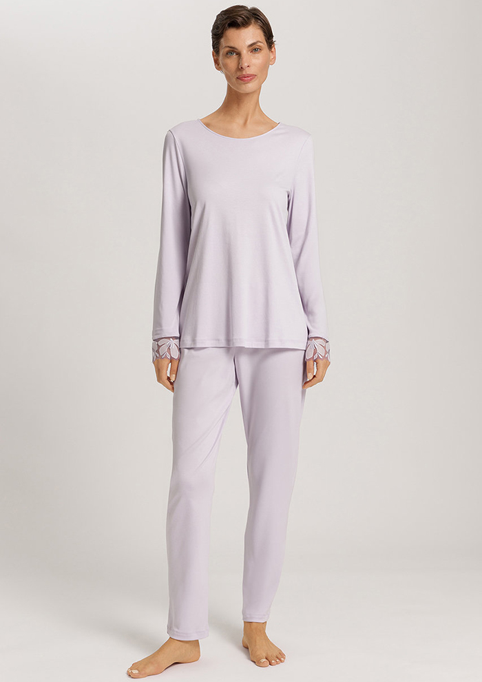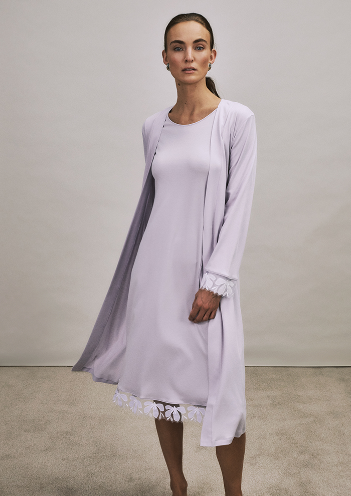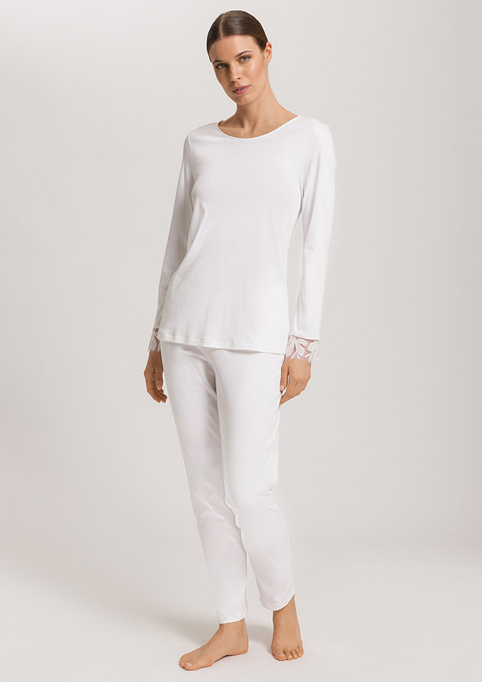 「キャミソールは胸元から脇下まで配したジャカードレースが繊細で美しいデザイン。秋冬はもちろん、春先でも使えるくらい軽やかな着心地です。裾まわりにレースをあしらったショーツも、ペチショーツとしてワンピースやスカートの下に合わせられてロングシーズン活躍。七分袖のトップスも胸元のレースが魅力的。今年は存在感のある太幅レースを使用しているので、あえてアウターの下からレースを見せるコーディネートもおすすめ。ジャケットインナーとしても着用できます。アンクル丈のロングボトムにも足首まわりにレースをプラス。寒さが厳しい日にワイドパンツやスカートの下に着用するのはもちろん、自宅でのリラックスウェアとしても◎」。
