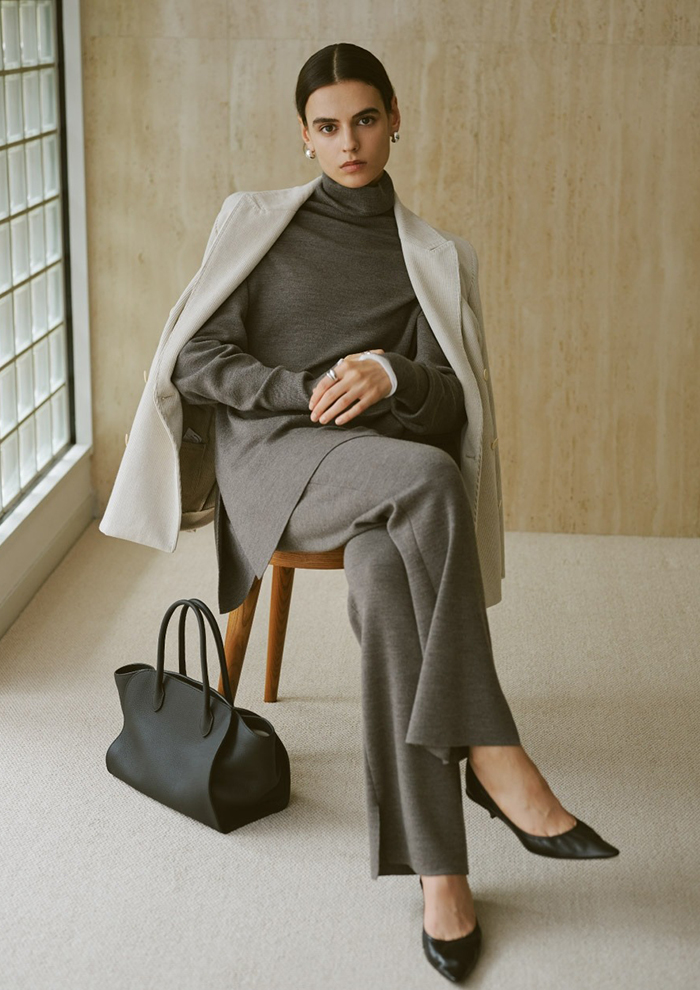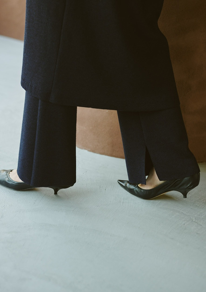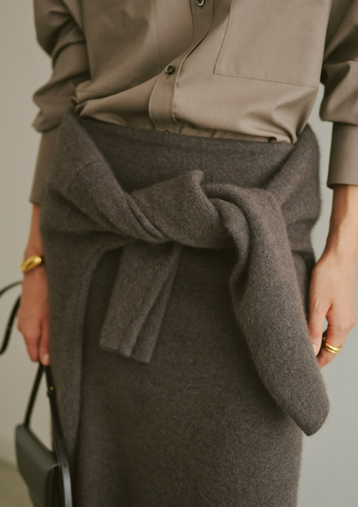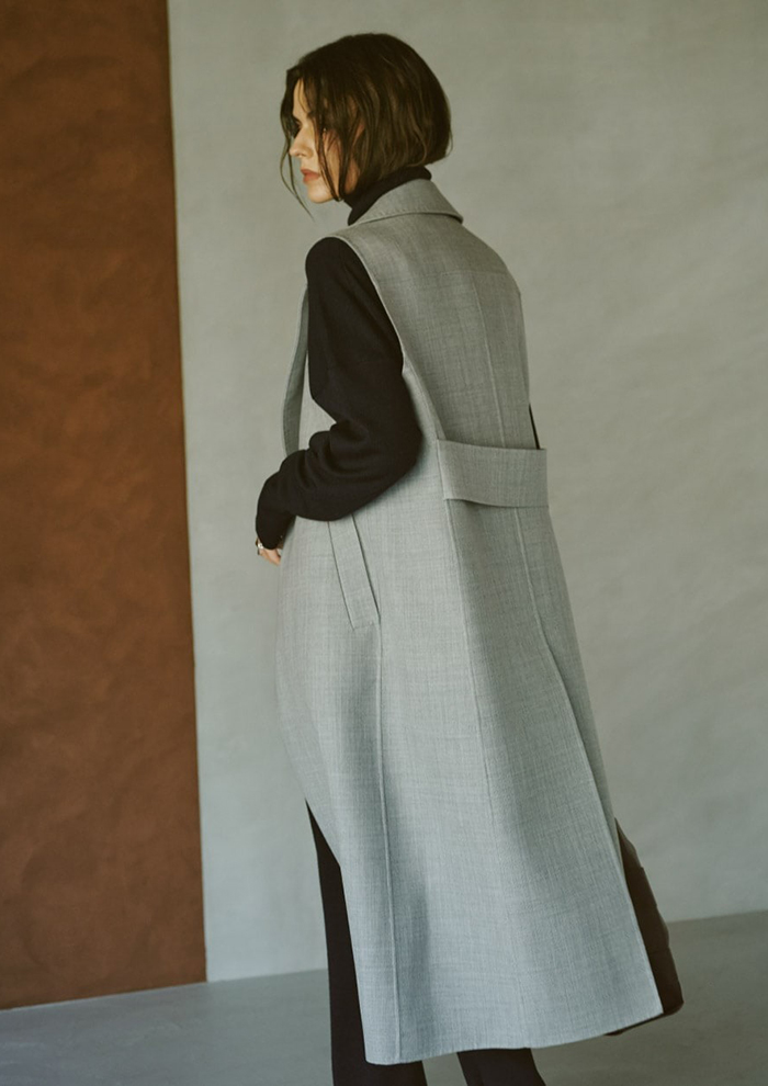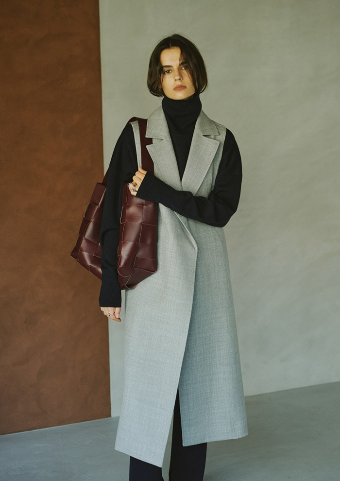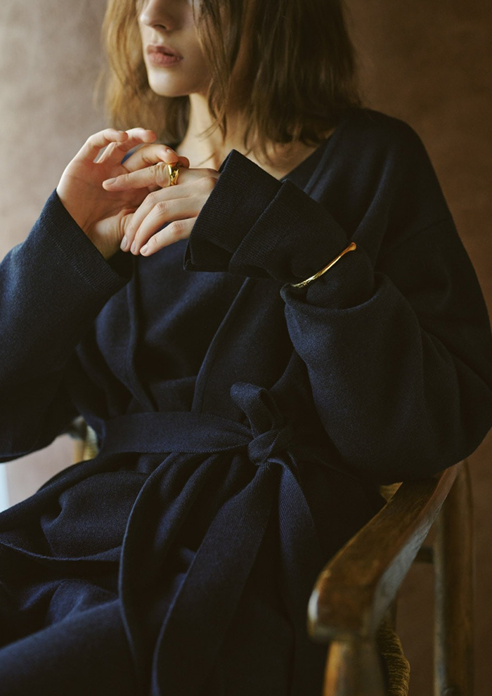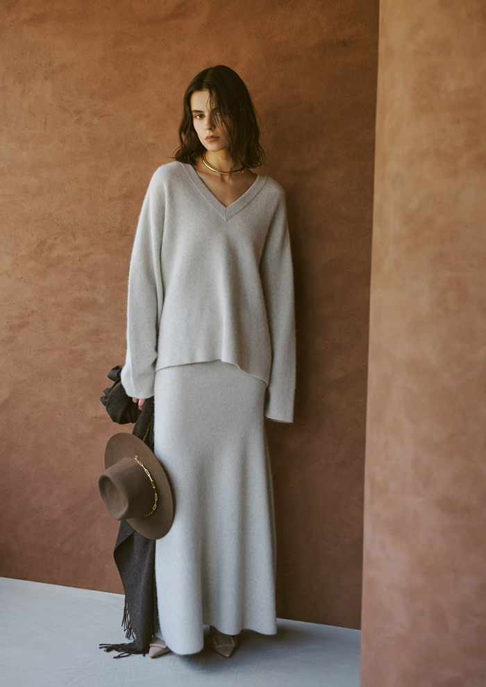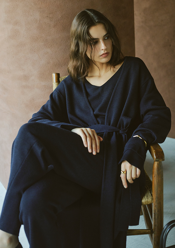 「今シーズンは新色としてグレージュとネイビーが加わり、新型のロングカーディガンも登場。セットで着ていただけるバリエーションがさらに広がりました。ワンツーのセットアップにロングカーディガンをプラスすることでより女性らしく、ラグジュアリーな印象に。コート代わりにさらっと羽織ったり、ベルトでウエストマークしたりと、着こなしのアレンジも自在です」。